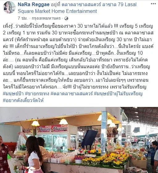 เพิ่งรู้..ว่าสมัยนี้ใช้เหรียญซื้อของราคา 30 บาทไม่ได้แล้ว !!! เหรียญ 5 เหรียญ 2 เหรียญ 1 บาท รวมกัน 30 บาทจะซื้อกระทงร้านมนุษย์ป้า ณ ตลาดลาซาลสแควร์ (พิกัดร้านหน้าสุด แถบด้านขวา) จ่ายด้วยเงินเหรียญ 30 บาท ป้าไม่เอาค่ะ !!! เด็กที่ร้านเอาเหรียญไปยื่นให้ป้า ป้าตะโกนดังลั่นว่า...นี่เงินใครจ้ะ แบงค์ไม่มีหรอ...ก็เลยตอบป้าว่าไม่มีค่ะ มีแต่เหรียญ...ป้าพูดอีก..งั้นเหรียญ 10 ล่ะ.... (ณ ตอนนั้น คือมีแค่เหรียญ เดินกลับไปเอาที่รถมา เพราะยังไม่ได้กดตังค์) เลยบอกป้าว่าไม่มี มีเหรียญแบบนั้นแหละค่ะ ป้ายังยืนกราน..ว่าเหรียญแบบนี้ ทอนใครก็ไม่อยากได้กัน...เลยบอกป้าว่า งั้นไม่เป็นค่ะ ไม่เอากระทงละ... แกก็ยื่นกระจาดเหรียญให้หยิบ ละบอกว่า..เอาไปเลยจ้ะๆๆ เพราะทอนใครก็ไม่มีใครอยากได้หรอก....จ้ะ!!! ป้าผู้ไม่ขายกระทง เพราะไม่รับเหรียญ