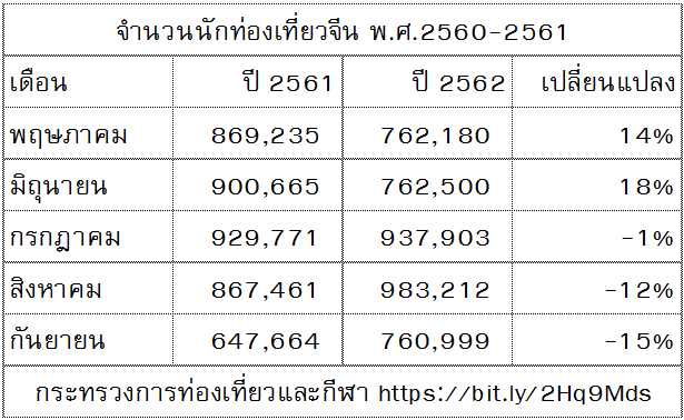 จากสถิติ 2 เดือน (สิงหาคม-กันยายน) จำนวนนักท่องเที่ยวลดลง 12%-15% หรือลดลงกว่าปีที่แล้ว 229,086 คน หากอนุมานเดือนตุลาและพฤศจิกายน ณ อัตราเดียวกันก็เท่ากับนักท่องเที่ยวจีนหายไป 458,172 คน ในช่วงเดือนสิงหาคม - พฤศจิกายน 2561 อันที่จริงจำนวนนักท่องเที่ยวน่าจะเพิ่มขึ้นเดือนละ 12%-15% มากกว่าจะลดลง ดังนั้นก็เท่ากับจำนวนนักท่องเที่ยวในช่วงดังกล่าว หายไปราว 916,344 คน