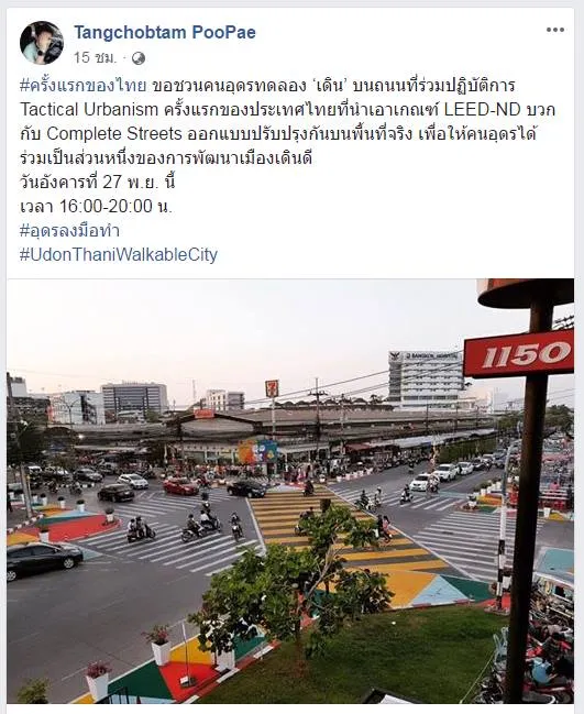 #ครั้งแรกของไทย ขอชวนคนอุดรทดลอง ‘เดิน’ บนถนนที่ร่วมปฏิบัติการ Tactical Urbanism ครั้งแรกของประเทศไทยที่นำเอาเกณฑ์ LEED-ND บวกกับ Complete Streets ออกแบบปรับปรุงกันบนพื้นที่จริง เพื่อให้คนอุดรได้ร่วมเป็นส่วนหนึ่งของการพัฒนาเมืองเดินดี