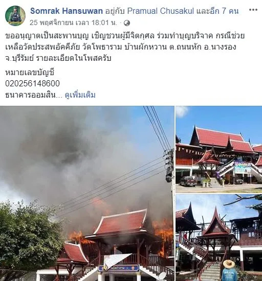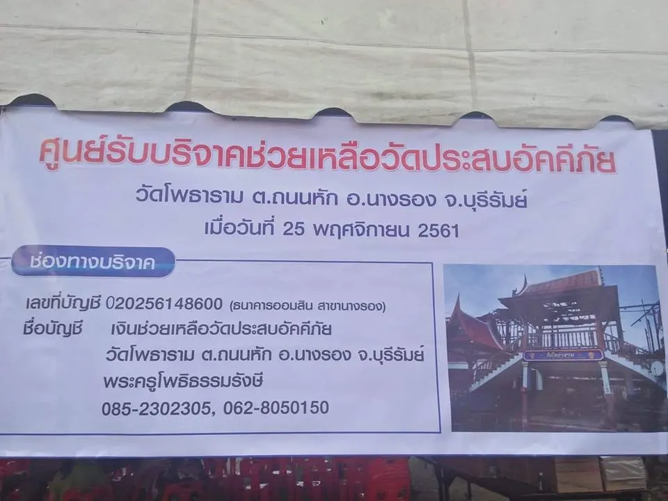 ขออนุญาตเป็นสะพานบุญ เชิญชวนผู้มีจิตกุศล ร่วมทำบุญบริจาค กรณีช่วยเหลือวัดประสพอัคคีภัย วัดโพธาราม บ้านผักหวาน ต.ถนนหัก อ.นางรอง จ.บุรีรัมย์ รายละเอียดในโพสครับ