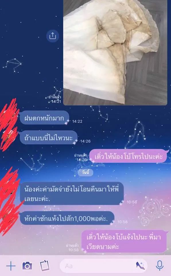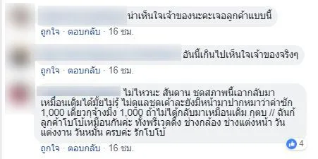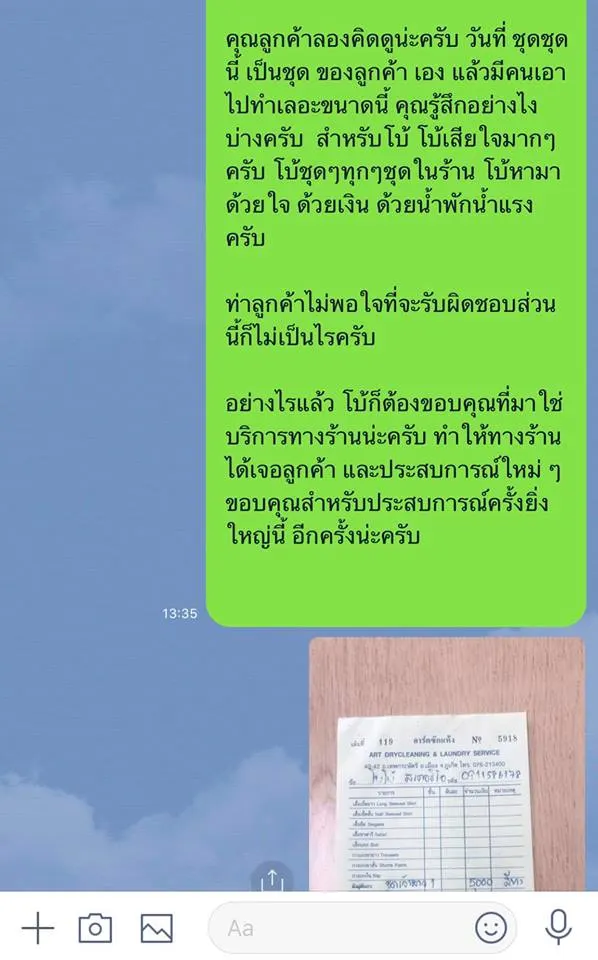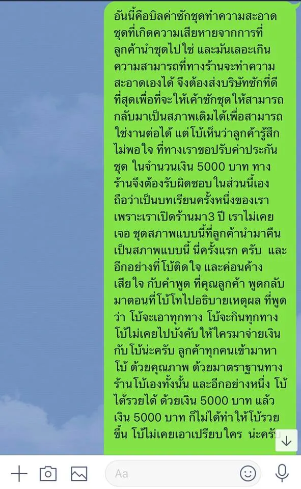 ตั้งแต่ลูกค้าค้ามาคืนชุดยังไม่ได้ยินคำขอโทษสักคำเดียว เราโทรไปอธิบาย ว่าเราขอหักค่าประกันชุดเพื่อเป็นค่าใช่จ่ายในการส่งซักรีด แต่ลูกค้า กับต่อว่าเรากลับมาว่า “ไม่เกินไปหน่อยเหรอ ก็ฝนมันตกจะให้ทำอย่างไร ไม่ไหวน่ะแบบนี้ จะกินทุกทางจะเอาทุกทาง” คำนี้โบ้เจ็บจี๊ดๆ มากๆเลยครับ โบ้ทำร้านมาโบ้ไม่เคยที่จะเอาเปรียบใคร โบ้กล้าพูดตรงนี้ ว่า โบ้ไม่เคยบังคับให้ใครมาซื้อแพ็คเกจที่ร้าน แล้วเราก็ไม่ได้เก็บค่าใช่จ่ายคุณเพิ่มนอกเหนือจากแพ็คเกจที่เราตกลงกันไว้ด้วย
