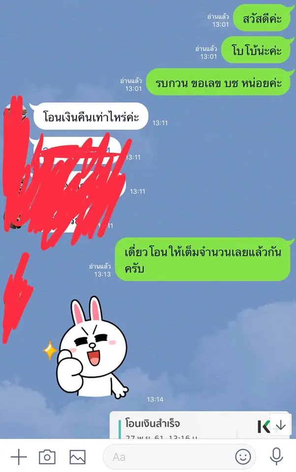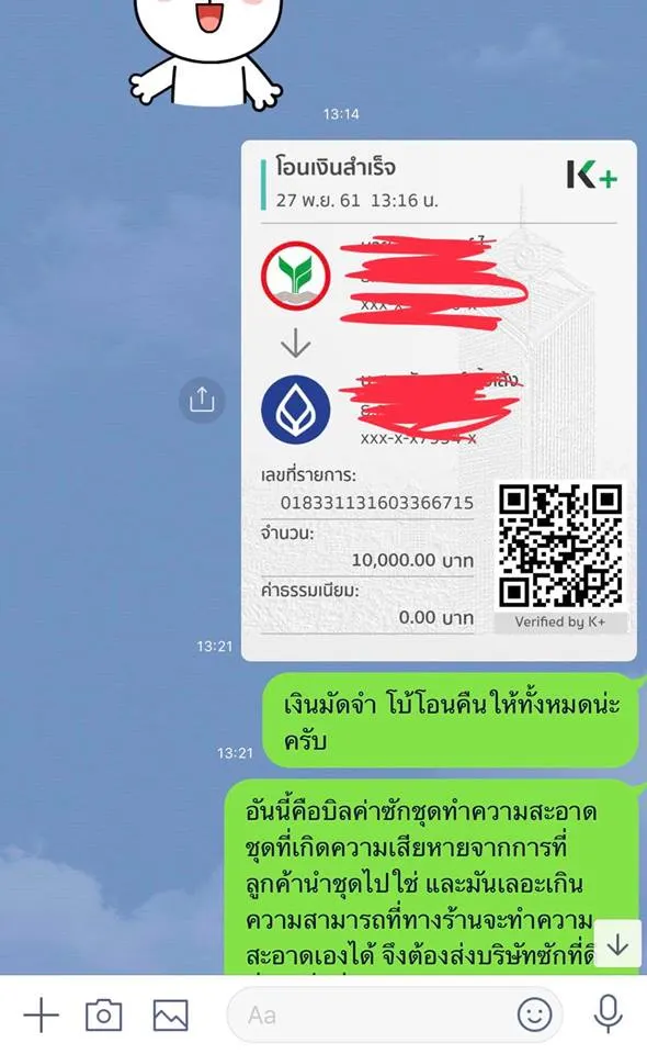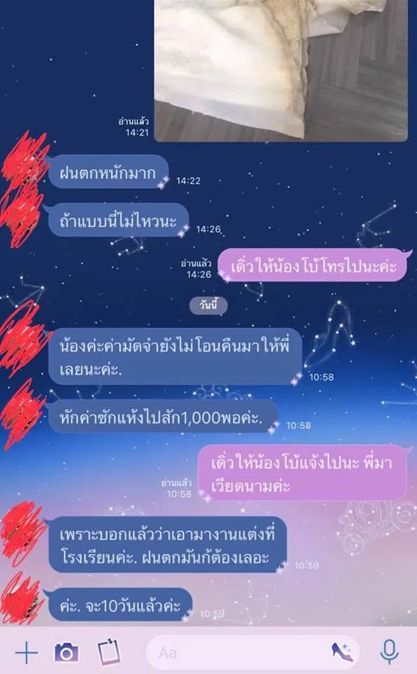 นอกจากนี้ยังบอกกับทางร้านว่าหักค่าซักรีดชุดไปแค่1,000บาทก็พอแล้ว และเร่งให้ทางร้านโอนเงินประกันชุดคืนมาให้อีกด้วย