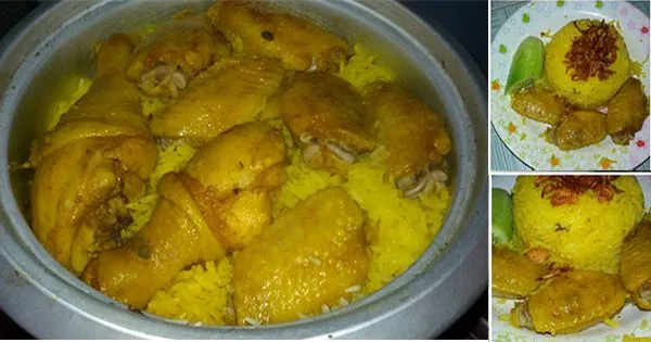 5.นำข้าวมาหุง ใส่น้ำน้อยกว่าหุงข้าวปกติเล็กน้อย และใส่ไก่ที่ทอดแล้วลงในหม้อข้าว จัดเรียงตามใจชอบ (ตรงนี้เราเพิ่มความหอมด้วยน้ำซุปคนอร์ใส่ไป 1 ก้อน)