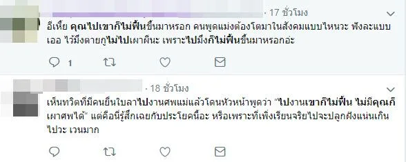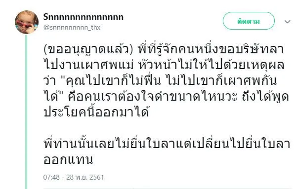 ในทวิตเตอร์ @snnnnnnnnn_thx เล่าว่า (ขออนุญาตแล้ว) พี่ที่รู้จักคนหนึ่งขอบริษัทลาไปงานเผาศพแม่ หัวหน้าไม่ให้ไปด้วยเหตุผลว่า คุณไปเขาก็ไม่ฟื้น ไม่ไปเขาก็เผาศพกันได้ คือคนเราต้องใจดำขนาดไหนวะ ถึงได้พูดประโยคนี้ออกมาได้ พี่ท่านนั้นเลยไม่ยื่นใบลาแต่เปลี่ยนไปยื่นใบลาออกแทน