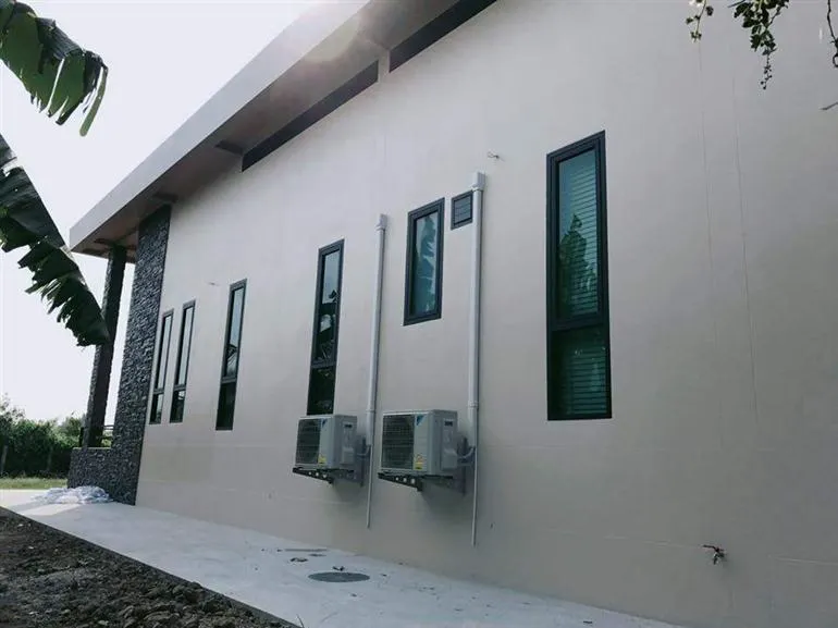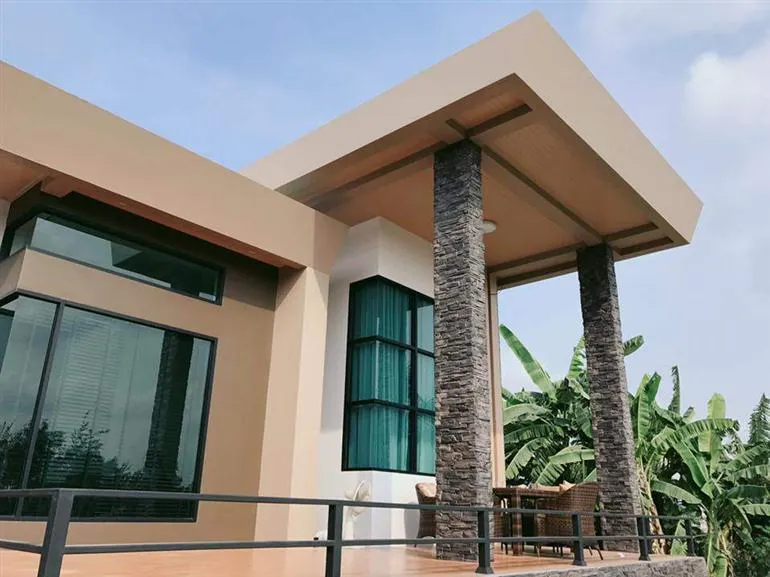 อีกหนึ่งหลังที่สวยน่าอยู่มากๆ สำหรับบ้านชั้นเดียวสไตล์โมเดิร์นหลังนี้ครับ มองจากภายนอกจะพบกับความโโเด่นสะดุดตาด้วยโครงสร้างคอนกรีตหลังคาทรงเพิงหมาแหงน พื้นบ้านถูกยกขึ้นเล็กน้อย ภายนอกใช้โทนสีครีมเป็นหลัก แต่ด้านหน้าของบ้านถูกตกแต่งด้วยผนังด้วยอิฐสีเทาเข้ม เสริมความสวยงาทันสมัย ดูมีมิติในตัวบ้านเอามากๆ ด้านหน้ายังมีระเบียงเล็กๆ ไว้พักผ่อนในครอบครัวด้วย ผนังบ้านออกแบบได้อย่างลงตัว เน้นการตกแต่งด้วยหน้าต่างประตูกระจกที่เป็นงานอลูมิเนียมรมดำ ได้ความโมเดิร์นทันสมัยไปเต็มๆ เลยทีเดียว