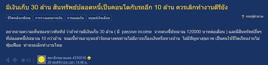 สมาชิกเวบไซต์พันทิป สมาชิกหมายเลข 4335516 คิดไม่ตก อยากถามว่ามีเงินเก็บ 30 ล้าน สินทรัพย์ปลอดหนี้เป็นคอนโดกับรถอีก 10 ล้าน ควรเลิกทำงานดีรึยัง โดยได้ตั้งกระทู้ถามรายละเอียดดังนี้