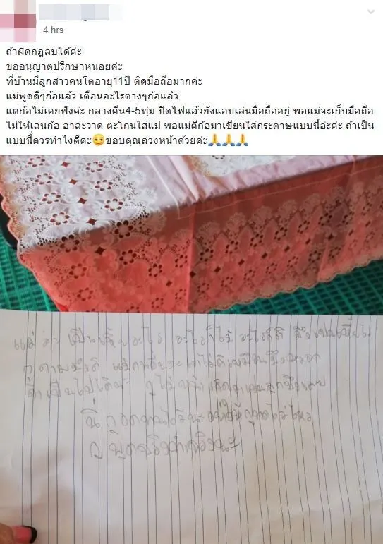 คุณแม่รายหนึ่ง เปิดเผยเรื่องราวที่เป็นปัญหากลุ้มใจผ่านเฟซบุ๊กส่วนตัว ถึงพฤติกรรมของลูกสาววัย 11 ขวบ ที่ติดเล่นโทรศัพท์มือถืออย่างหนัก แม้ในเวลานอน 4 - 5 ทุ่ม ลูกสาวของเธอก็ยังคงแอบเล่น เมื่อผู้เป็นแม่ห้ามปราม ลูกสาวก็จะแสดงพฤติกรรมก้าวร้าวด้วยการตะโกน อาละวาด ตอบกลับมาอยู่บ่อยครั้ง
