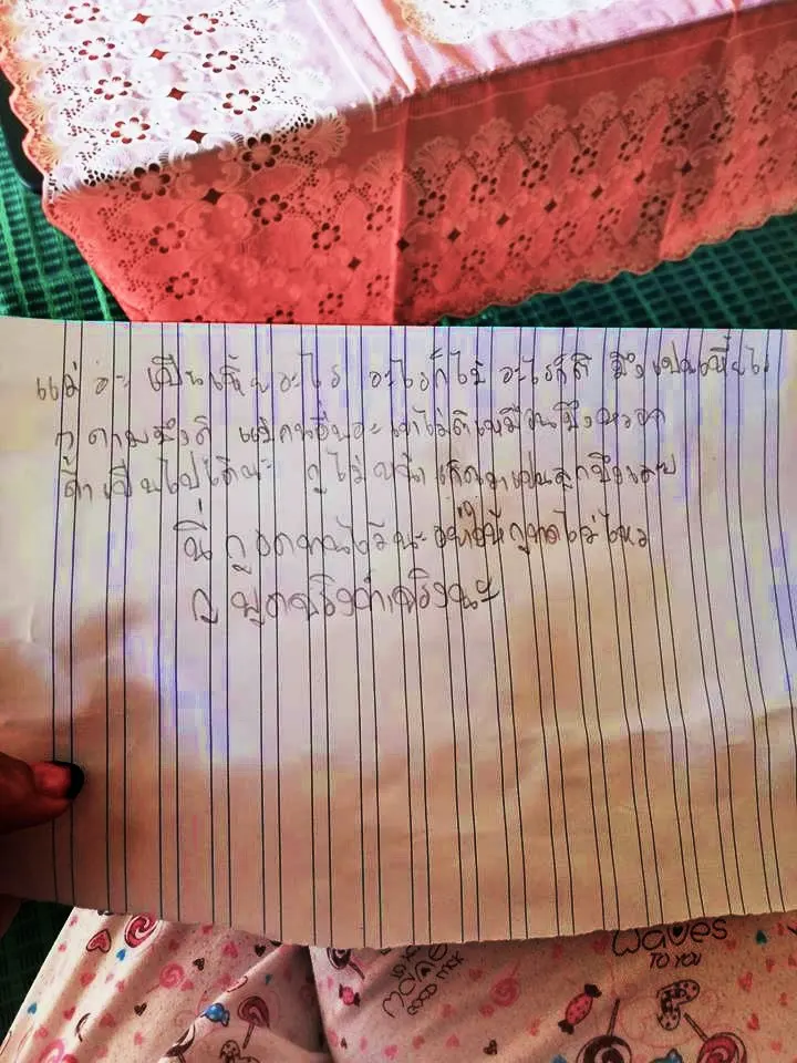 ข้อความในกระดาษระบุว่า.. เเม่อะเป็นเ...้* อะไร อะไรก็ไม่ อะไรก็ติ มึ*เป็นเ...้*ไร กูถามมึงดิ เเม่คนอื่นอะเขาไม่ติเหมือนมึ*หรอก ถ้าเป็นไปได้นะ GUไม่น่าเกิดมาเป็นลูกมึ*เลย นี่GU อดทนไว้นะ อย่าให้GUทนไม่ไหว GUพูดจริงทำจริงนะ
