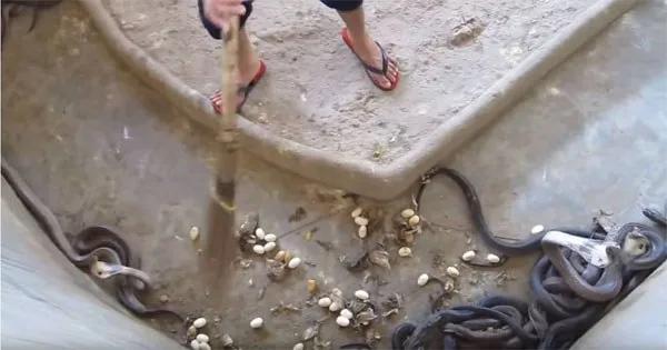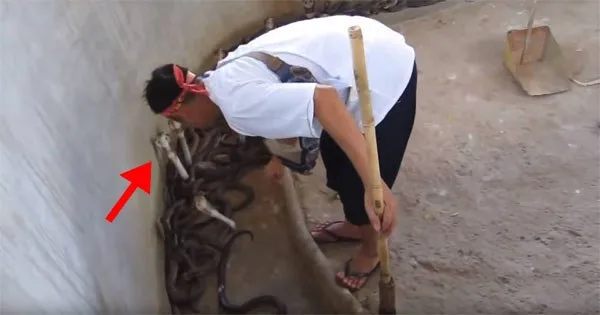 กำลัง ทำความสระอาดพื้นที่อยู่ โดยมี งูอยู่เป็นจำนวนมาก (คือเยอะเลยล่ะ)