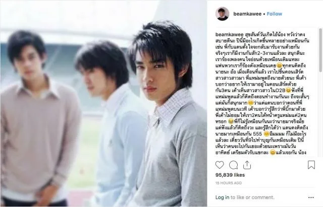 ด้านหนุ่มบีมก็ได้โพสต์ภาพวงดีทูบีและเขียนข้อความว่า “สุขสันต์วันเกิดไอ้น้อง หวังว่าคงสบายดีนะ ปีนี้มีอะไรเกิดขึ้นหลายอย่างเหมือนกัน เช่น พี่กับแดนตั้งใจจะกลับมารับงานด้วยกัน จริงๆ เราก็มีงานกันสัก 2-3 งานแล้วละ สนุกดีนะ เราร้องเพลงคนใจอ่อนด้วยเหมือนเดิมแหละ แฟนพวกเราก็ร้องดังเหมือนเคย ทุกคนคิดถึงนายนะ อ้อ เมื่อเดือนที่แล้ว เราไปขึ้นคอนเสิร์ต สาวสาวสาว มา