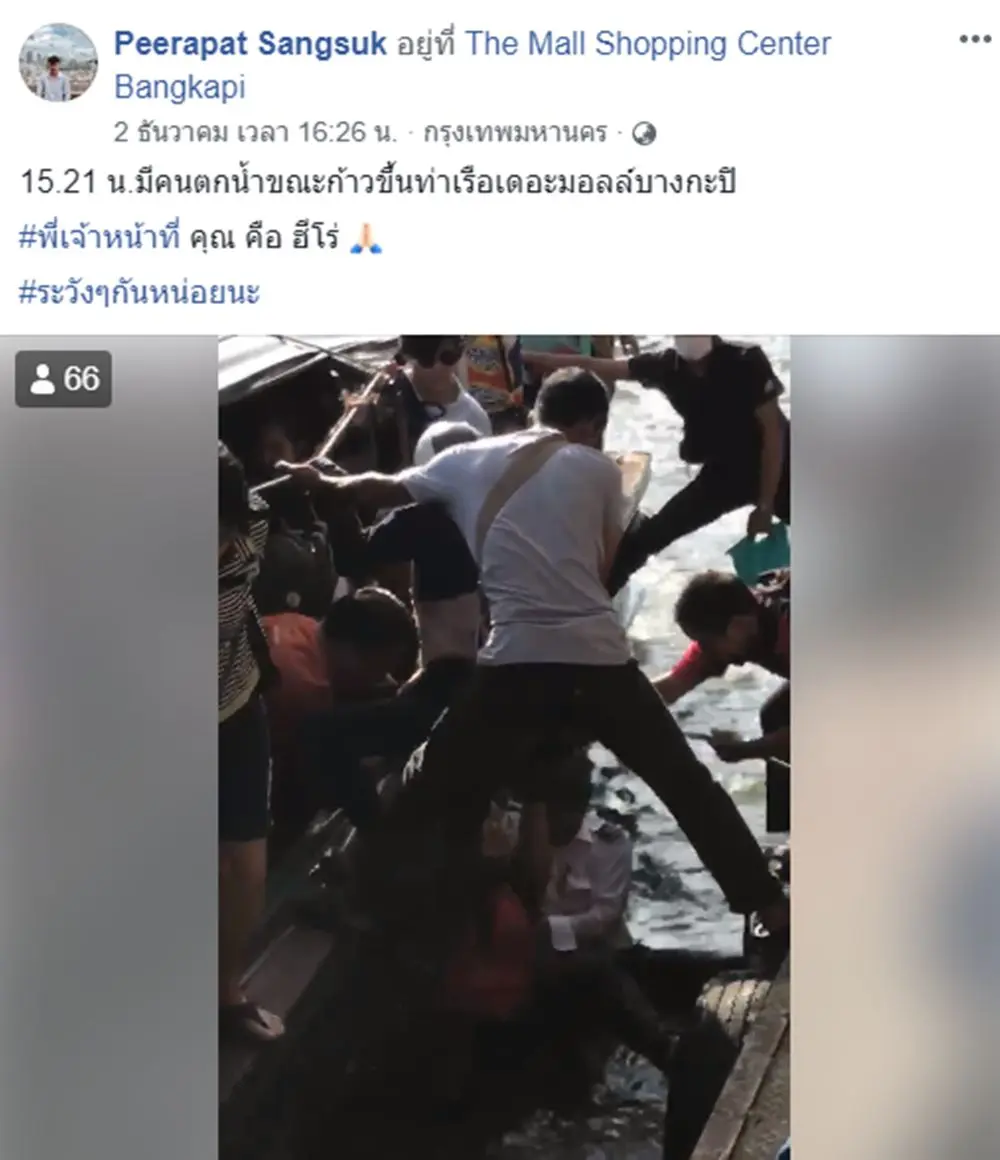 โดยผู้ใช้เฟสบุ๊ค Peerapat Sangsuk ได้โพสต์คลิปวิดิโอ ขณะเจ้าหน้าที่รายหนึ่งได้กระโดดลงคลองแสนแสบเพื่อช่วยเหลือ ประชาชนที่ตกลงไปในน้ำ โดยระบุข้อความว่า