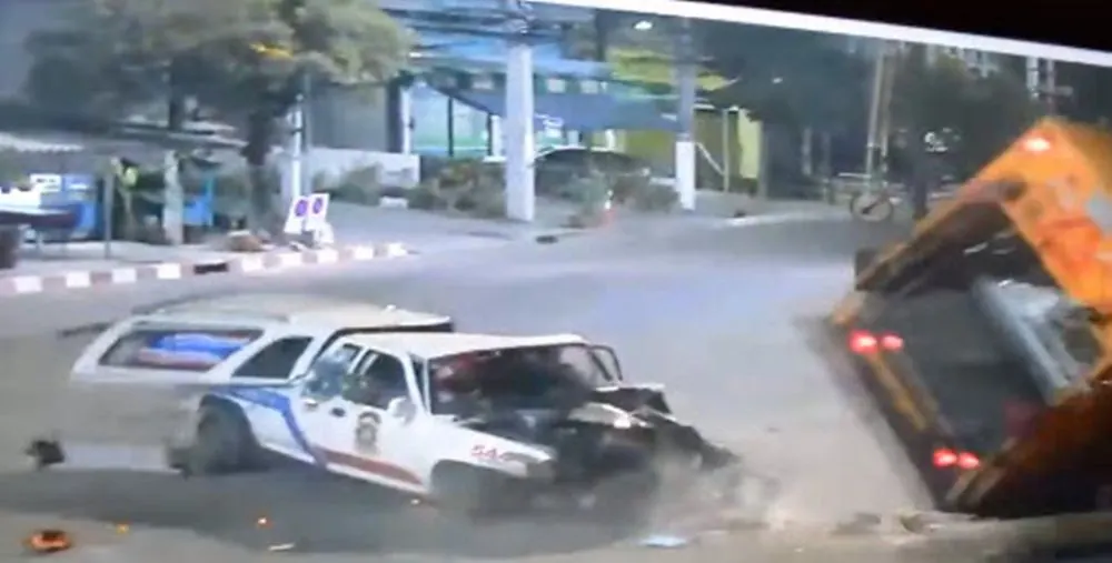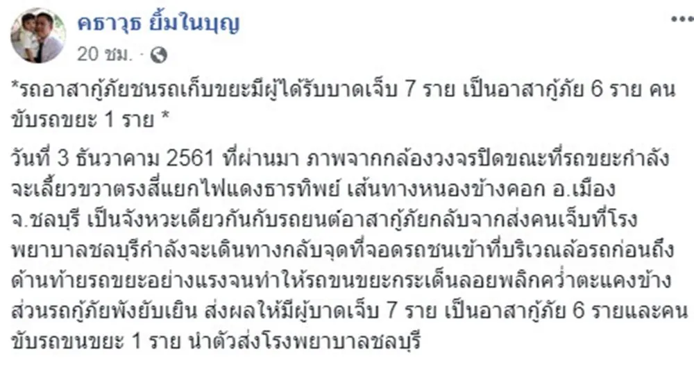 "รถอาสากู้ภัยชนรถเก็บขยะมีผู้ได้รับบาดเจ็บ 7 ราย เป็นอาสากู้ภัย 6 ราย คนขับรถขยะ 1 ราย วันที่ 3 ธันวาคาม 2561 ที่ผ่านมา ภาพจากกล้องวงจรปิดขณะที่รถขยะกำลังจะเลี้ยวขวาตรงสี่แยกไฟแดงธารทิพย์ เส้นทางหนองข้างคอก อ.เมือง จ.ชลบุรี เป็นจังหวะเดียวกันกับรถยนต์อาสากู้ภัยกลับจากส่งคนเจ็บที่โรงพยาบาลชลบุรีกำลังจะเดินทางกลับจุดที่จอดรถชนเข้าที่บริเวณล้อรถก่อนถึงด้านท้ายรถขยะอย่างแรงจนทำให้รถขนขยะกระเด็นลอยพลิกคว่ำตะแคงข้างส่วนรถกู้ภัยพังยับเยิน ส่งผลให้มีผู้บาดเจ็บ 7 ราย เป็นอาสากู้ภัย 6 รายและคนขับรถขนขยะ 1 ราย นำตัวส่งโรงพยาบาลชลบุรี"