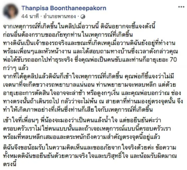 จากที่ได้ดูคลิปแล้วดิฉันก็เข้าใจเหตุการณ์ที่เกิดขึ้น คุณพ่อก็ชี้แจงว่าไม่มีเจตนาที่จะกีดขวางรถพยาบาลแน่นอน ท่านพยายามจะหลบหลีก แต่ด้วยอายุเยอะการตัดสินใจอาจจะล่าช้า หรือดูงกๆ เงิ่นๆ และคุณพ่อบอกว่า ณ ช่องทางตรงนั้นถ้าเดินรถไป กลัวว่าจะไม่พ้น ณ สายตาที่ท่านมองอยู่ตรงจุดนั้น จึงทำให้เกิดภาพอย่างที่เห็น ซึ่งท่านก็เสียใจกับเหตุการณ์ที่เกิดขึ้น