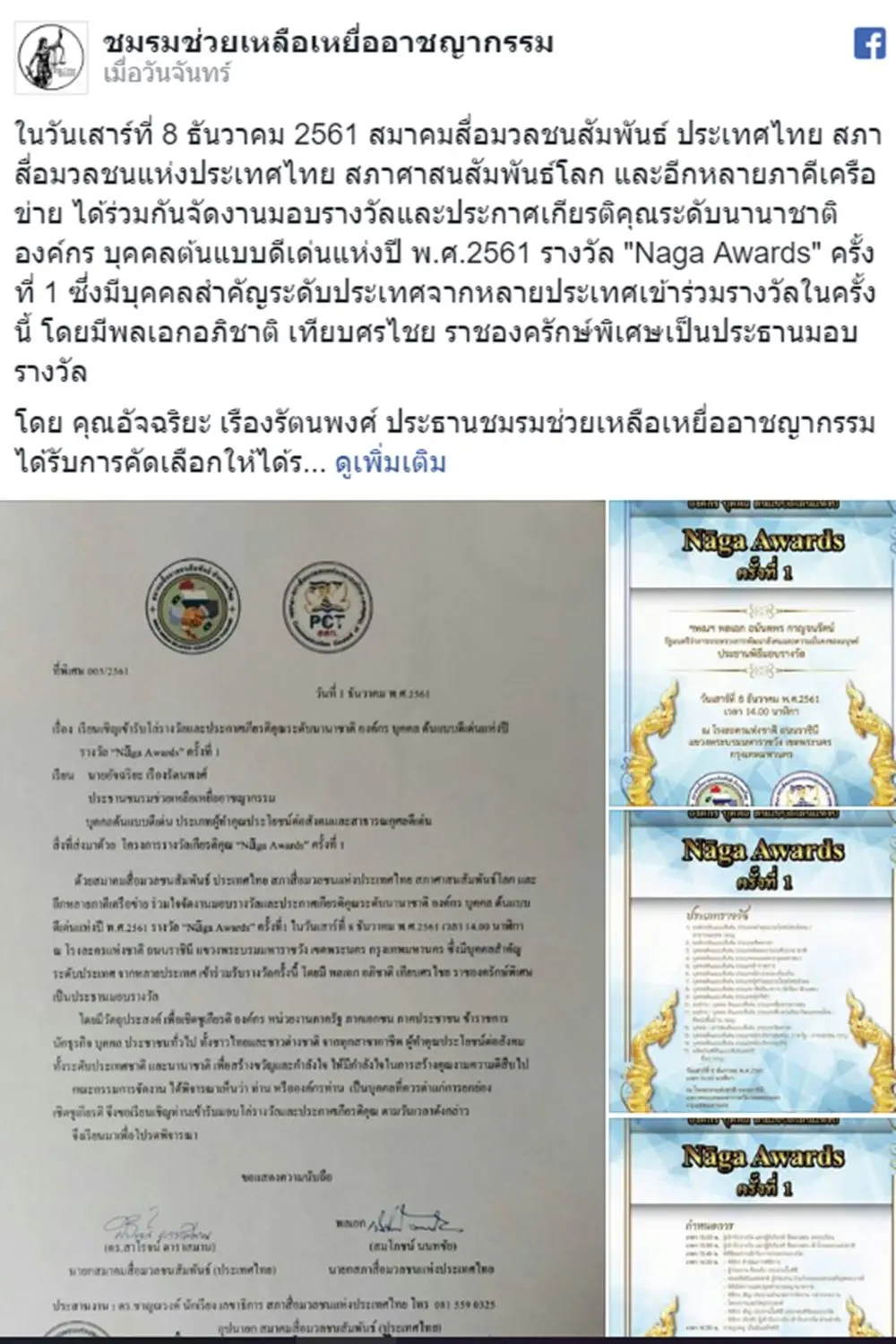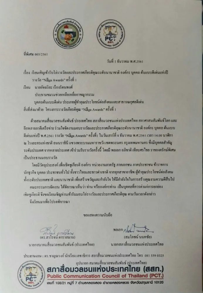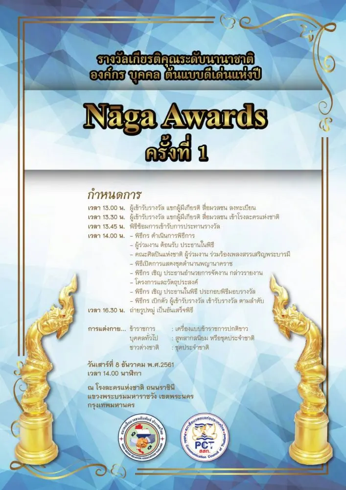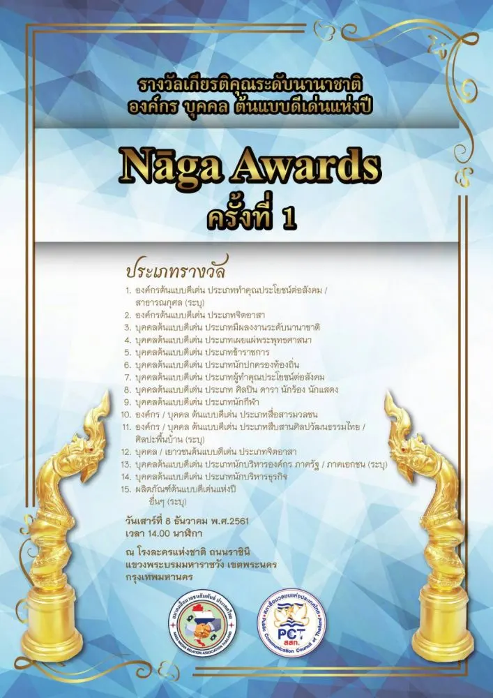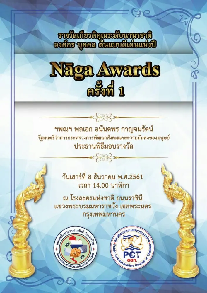 ได้ร่วมกันจัดงานมอบรางวัลและประกาศเกียรติคุณระดับนานาชาติ องค์กร บุคคลต้นแบบดีเด่นแห่งปี พ.ศ.2561″ กับ รางวัล “Naga Awards” ครั้งที่ 1 ซึ่งมีบุคคลสำคัญระดับประเทศจากหลายประเทศเข้าร่วมรางวัลในครั้งนี้