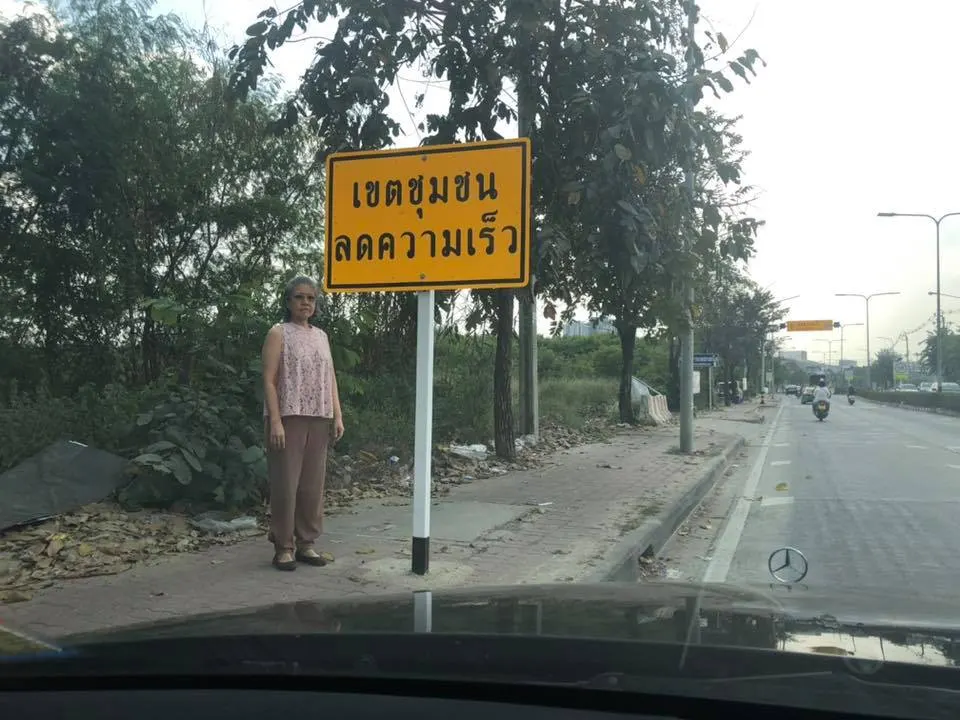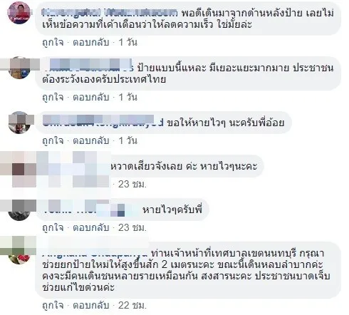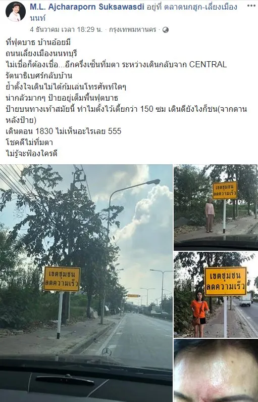 ม.ล. อัจฉราพร สุขสวัสดิ์ เดินชนป้ายที่มีความสูงต่ำกว่า 150 ซม. บนทางเดิน บนถนนเลี่ยงเมืองนนทบุรี บริเวณใกล้ๆกับเซ็นทรัลรัตนาธิเบศร์ แม้จะระวังแล้วก็ตาม แต่ป้ายที่มีความสูงไม่พ้นคนเดิน แถมป้ายใหญ่กินพื้นที่ทางเดิน ทำให้ผู้สัญจรไปมาเดินชนและเสี่ยงได้รับบาดเจ็บรุนแรงได้
