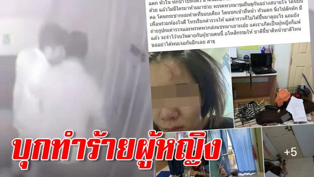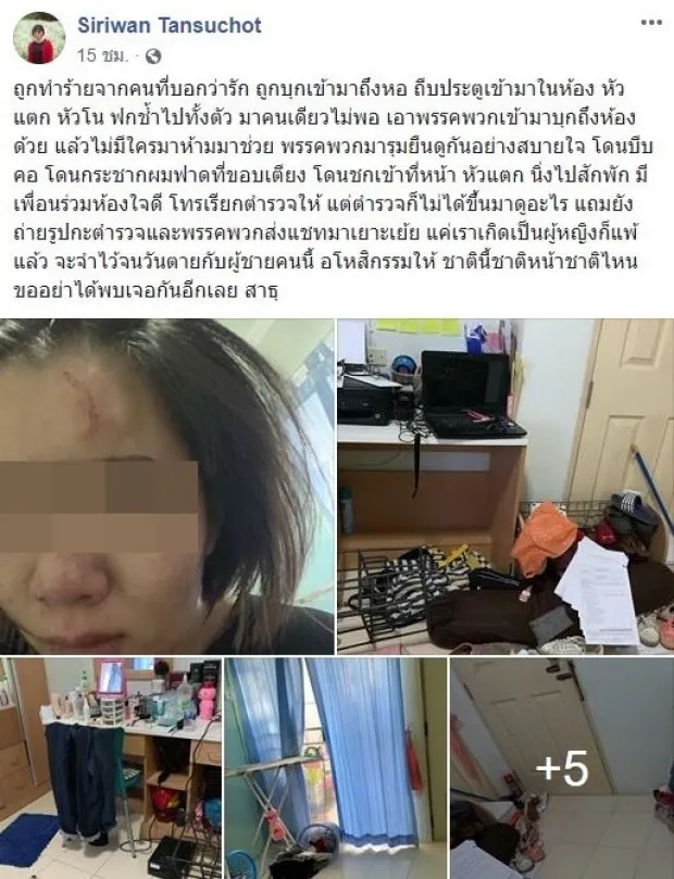 ผู้ใช้เฟซบุ๊กที่ใช้ชื่อว่า Siriwan Tansuchot ได้โพสต์ภาพพร้อมข้อความ ถูกแฟนหนุ่มพาพวกพังประตูบุกเข้ามาในห้อง ทำร้ายร่างกายเธอจนหัวแตกฟกช้ำไปทั้งตัว โดยเธอระบุข้อความไว้ว่า ถูกทำร้ายจากคนที่บอกว่ารัก ถูกบุกเข้ามาถึงหอ ถีบประตูเข้ามาในห้อง หัวแตก หัวโน ฟกช้ำไปทั้งตัว มาคนเดียวไม่พอ เอาพรรคพวกเข้ามาบุกถึงห้องด้วย แล้วไม่มีใครมาห้ามมาช่วย พรรคพวกมารุมยืนดูกันอย่างสบายใจ โดนบีบคอ โดนกระชากผมฟาดที่ขอบเตียง โดนชกเข้าที่หน้า หัวแตก นิ่งไปสักพัก มีเพื่อนร่วมห้องใจดี โทรเรียกตำรวจให้ แต่ตำรวจก็ไม่ได้ขึ้นมาดูอะไร แถมยังถ่ายรูปกะตำรวจและพรรคพวกส่งแชทมาเยาะเย้ย แค่เราเกิดเป็นผู้หญิงก็แพ้แล้ว จะจำไว้จนวันตายกับผู้ชายคนนี้ อโหสิกรรมให้ ชาตินี้ชาติหน้าชาติไหนขออย่าได้พบเจอกันอีกเลย สาธุ