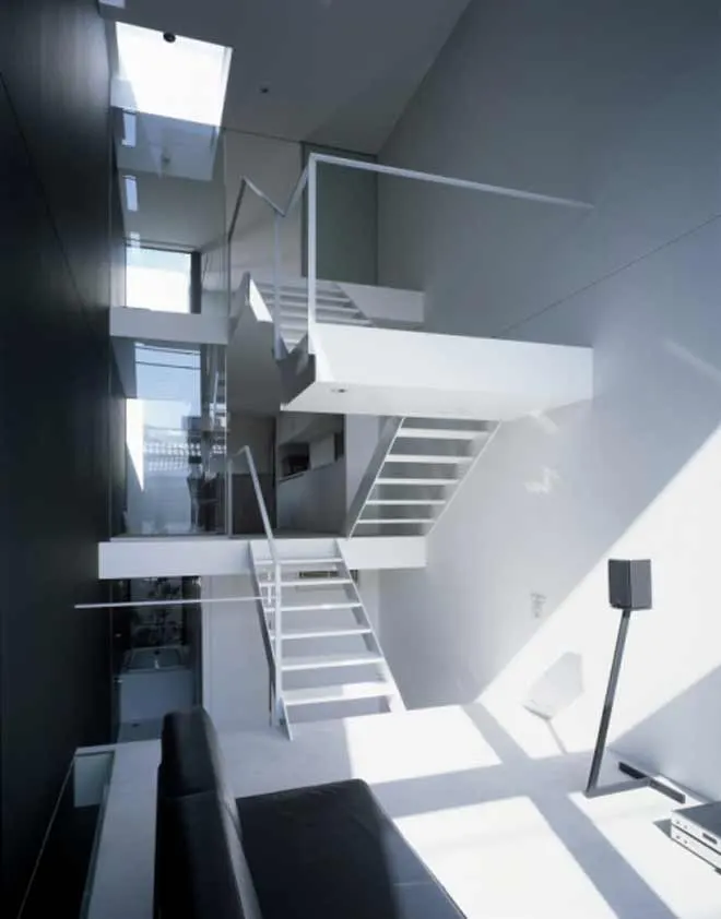 หลังที่สามนี้เป็นรูปแบบของอาคาร 4 ชั้นบนพื้นที่แคบๆ ตัวบ้านใช้กระจกใสทำให้มีความรู้สึกว่ามันโปร่งสบายมองเห็นกันได้หมด และได้รับแสงจากธรรมชาติอีกด้วย นอกจากนี้ยังออกแบบให้มีสวนอยู่ตรงกลางของบ้านอีกด้วยครับ บ้านหลังนี้ได้รับการออกแบบโดย Ryue Nishizawa