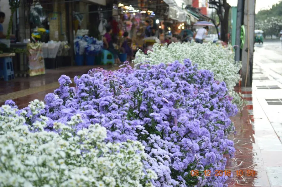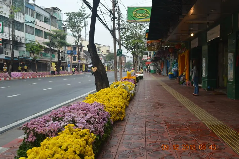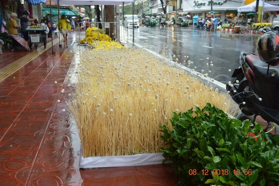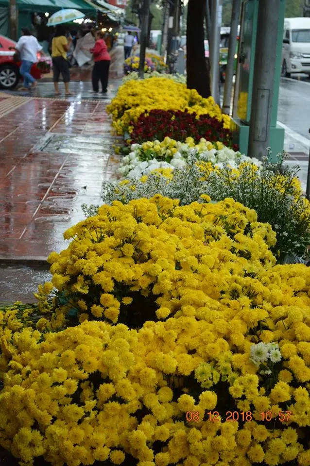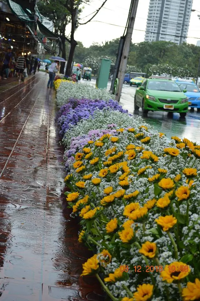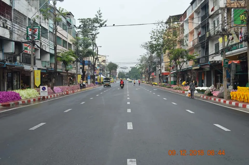 ภาพความสวยงามของดอกไม้สดทั้งสองฝากฝั่งถูกประดับตกแต่งจากฝีมือของชาวชุมชนปากคลองตลาด เพื่อรอต้อนรับกิจกรรมปั่นจักรยาน "Bike อุ่นไอรัก" ที่จะมีขึ้นในวันนี้ (9/12/61)