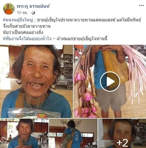 “#คนจนผู้ยิ่งใหญ่ ชายผู้เข็ญใจปราถนาถวายทานแด่คณะสงฆ์ แต่ไม่มีทรัพย์ จึงเก็บสายบัวมาถวายทาน นับว่าเป็นกุศลอย่างยิ่ง #ทีมงานจึงได้มอบถุงน้ำใจ ~ผ้าห่มแก่ชายผู้เข็ญใจท่านนี้”