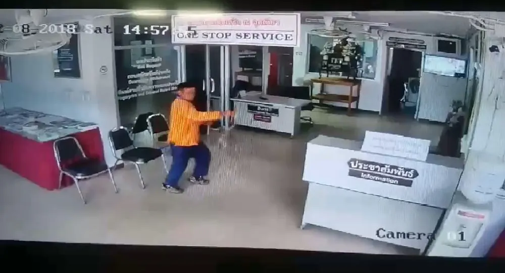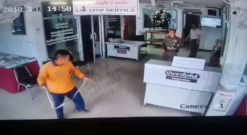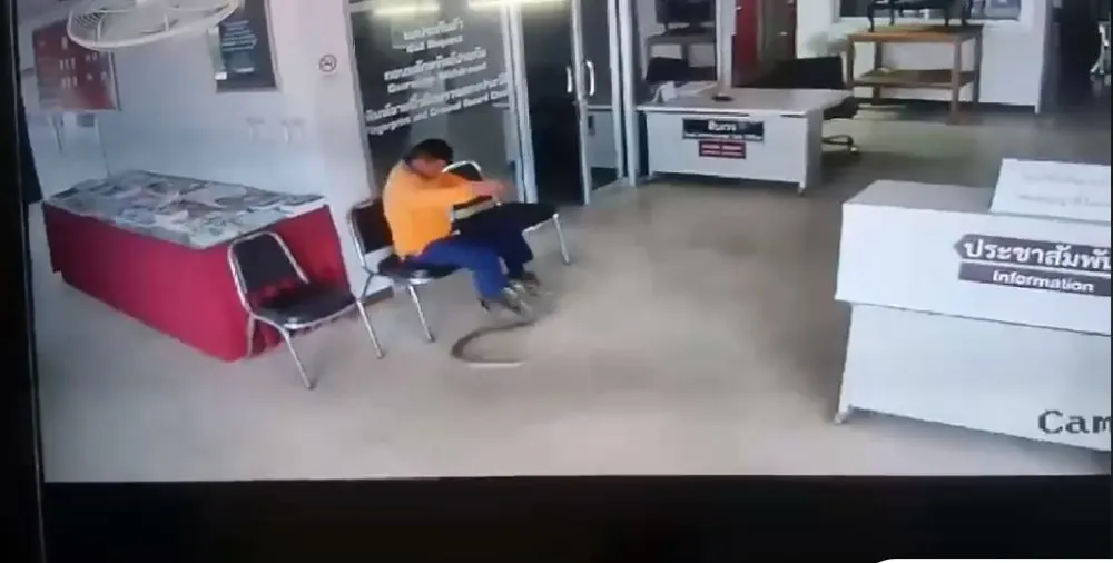 เป็นคลิปที่มีการเเชร์กันอย่างล้นหลามในโลกออนไลน์บ้านเรา กับกรณีสุดอุกอาจบุกทำร้ายร่างกายบนโรงพัก ของ เจ้างูตัวหนึ่ง ที่อยู่ดีๆเลื้อยเข้ามาในโรงพักผ่านประตูหน้า ก่อนจะเห็นชายคนหนึ่งนั่งรออยู่ที่เก้าอี้ ก็ชูคอเข้าบุก พร้อมฉกทันที เเต่มันไม่ได้ง่ายๆ ดั่งที่คิด เมื่อเจอคนจริง สติดี ไหวพริบสุดยอด ไหวตัวทัน จับงูซะอยู่หมัด โดนกระทืบไปหลายทีเลยเจ้างู เรียกได้ว่าโดนรวบคาโรงพัก สิ้นลาย ซึ่งในคลิปได้เกิดขึ้น ณ โรงพักเเห่งหนึ่ง โดยกล้องวงจรปิด จับภาพขณะที่ ชายเสื้อส้ม กำลังนั่งรออะไรบางอย่างในโรงพัก ก่อนที่ประตูหน้าโรงพักจะเห็นงูเลื้อยเข้ามาเเบบรวดเร็ว พุ่งมาหาชายเสื้อส้ม
