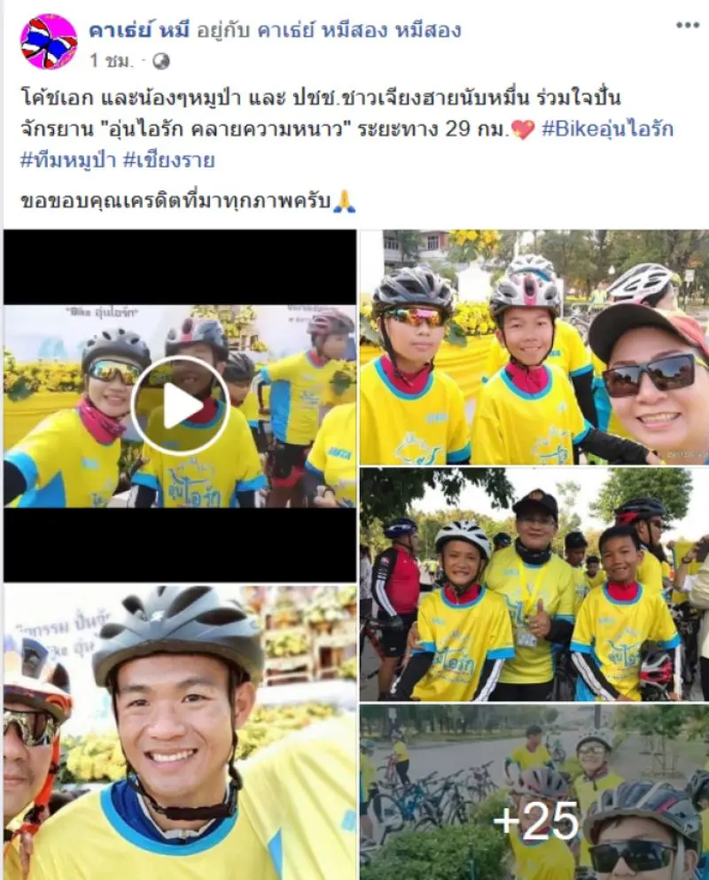 วันที่ 10 ธันวาคม 2561 ผู้สื่อข่าวรายงานว่า โลกออนไลน์มีการแชร์เรื่องราวของผู้ใช้เฟซบุ๊กชื่อ คาเธ่ย์ หมี โดยระบุข้อความว่า โค้ชเอก และน้องๆหมูป่า และ ปชช.ชาวเจียงฮายนับหมื่น ร่วมใจปั่นจักรยาน "อุ่นไอรัก คลายความหนาว" ระยะทาง 29 กม. #Bikeอุ่นไอรัก #ทีมหมูป่า #เชียงราย ขอขอบคุณเครดิตที่มาทุกภาพครับ