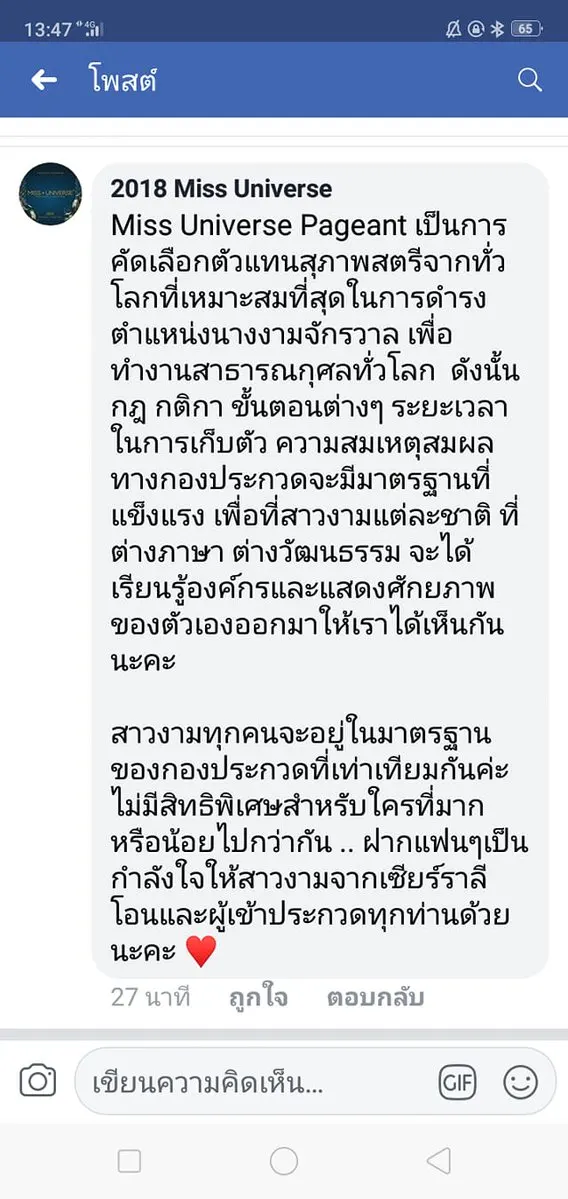 กองประกวดได้แถลงว่า กฏก็ต้องเป็นไปตามกฏที่ได้ออกไว้ให้เป็นสากล