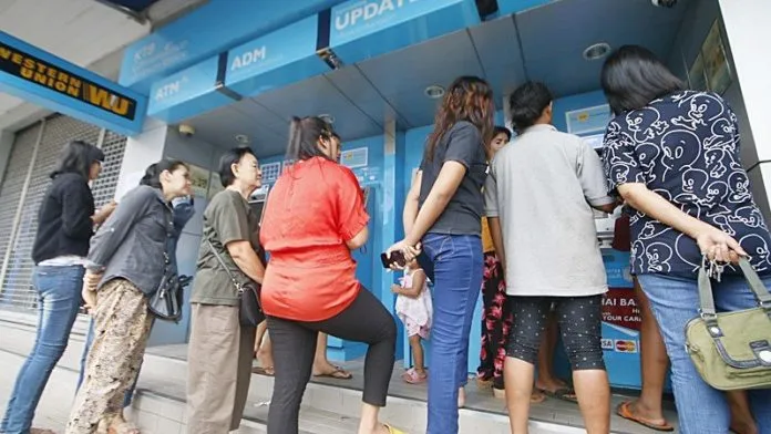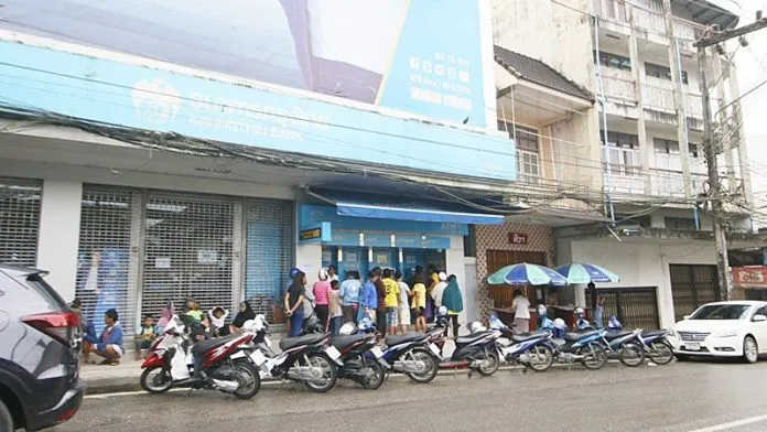 เมื่อเวลา 13.00 น. วันที่ 10 ธ.ค. ที่หน้าธนาคารกรุงไทย สาขาระนอง ต.เขานิเวศน์ อ.เมืองระนอง จ.ระนอง ยังคงมีประชาชนที่มีรายได้น้อย นำบัตรสวัสดิการแห่งรัฐ มาทยอยกันเข้าคิวเพื่อเตรียมกดเงิน จากตู้เอทีเอ็ม บางคนที่อยู่คนท้ายๆ ก็นั่งรอกับพื้นหน้าธนาคาร