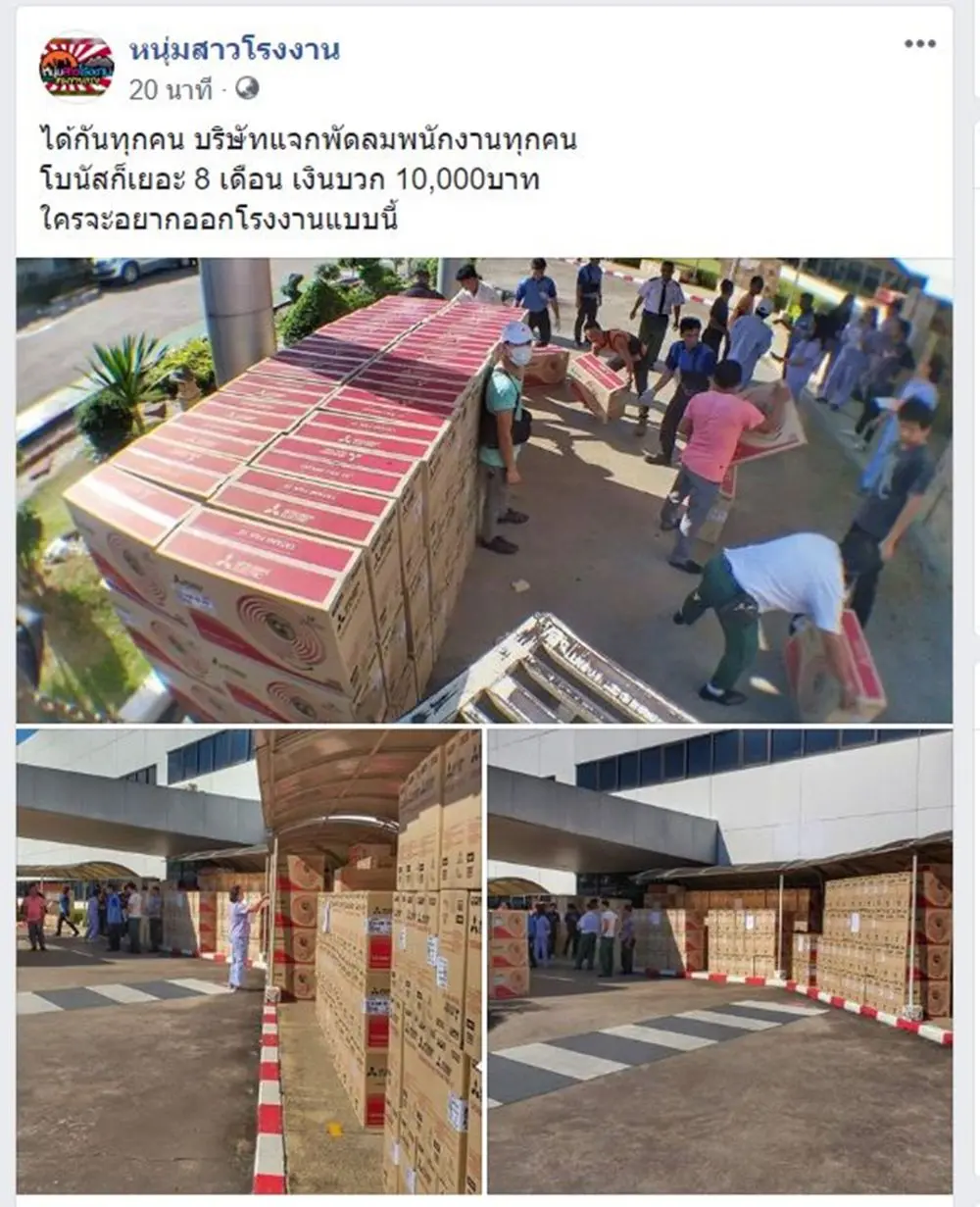 ในช่วงปลายปีแบบนี้มนุษย์เงินเดือนต่างรอคอยและลุ้นว่า “โบนัสประจำปี” จะอยู่ที่เท่าไหร่กัน ตามปกติอัตราโบนัสจะขึ้นอยู่กับเศรษฐกิจในปีนั้นๆ แน่นอนว่าถือเป็นแรงจูงใจที่สำคัญและสะท้อนสถานภาพของบริษัทด้วยเช่นเดียวกัน ทั้งนี้อัตราโบนัสค่าตอบแทนของแต่ละบริษัทในช่วงปลายปี จึงเป็นแรงดึงดูดให้แรงงานและพนักงานมีกำลังใจในการทำงานมากยิ่งๆขึ้นไปอีก ล่าสุดทางเพจดัง “หนุ่มสาวโรงงาน” ได้ออกมาโพสต์ภาพบริษัทของมิตซูบิชิ อีเล็คทริค ไทย ออโต้-พาร์ท จำกัด ที่นำพัดลมมาแจกพนักงานทุกคน แถมได้โบนัสอีก 8