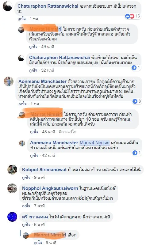 ขณะที่ เจ้าของโพสต์ได้คอมเมนต์ตอบว่า ไม่ดราม่าครับ เป็นการถ่ายคลิป เช็กถนนเรียบร้อย ก่อนถ่ายเตรียมตัวสำรวจเส้นทางมาเรียบร้อย ขี่วนไปมา 10 รอบ และเป็นคนพื้นที่รู้จักถนนเส้นนี้.