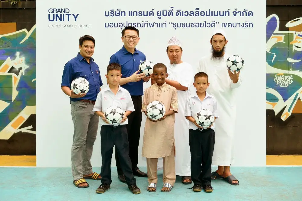 สิริพงศ์ ศรีสว่างวงศ์ (ที่ 2 จากซ้าย) กรรมการผู้จัดการ บริษัท แกรนด์ ยูนิตี้ ดิเวลล็อปเมนท์ จำกัด หรือ GRAND UNITY มอบอุปกรณ์กีฬาให้แก่ชุมชนซอยไวตี เขตบางรัก เพื่อร่วมสนับสนุนให้เด็กและเยาวชน รวมถึงชุมชนได้ใช้เวลาว่างให้เกิดประโยชน์ ซึ่งเป็นหนึ่งในกิจกรรมเพื่อชุมชนของ GRAND UNITY ที่ต้องการมอบสิ่งที่ดีให้กับชุมชนบริเวณรอบโครงการ โดยมี รังสรรค์ สังข์ทอง (ที่ 3 จากซ้าย) ประธานชุมชนซอยไวตี เป็นผู้รับมอบ เมื่อเร็วๆ นี้ ณ ชุมชนซอยไวตี ซอยสีลม 13 กรุงเทพฯ
