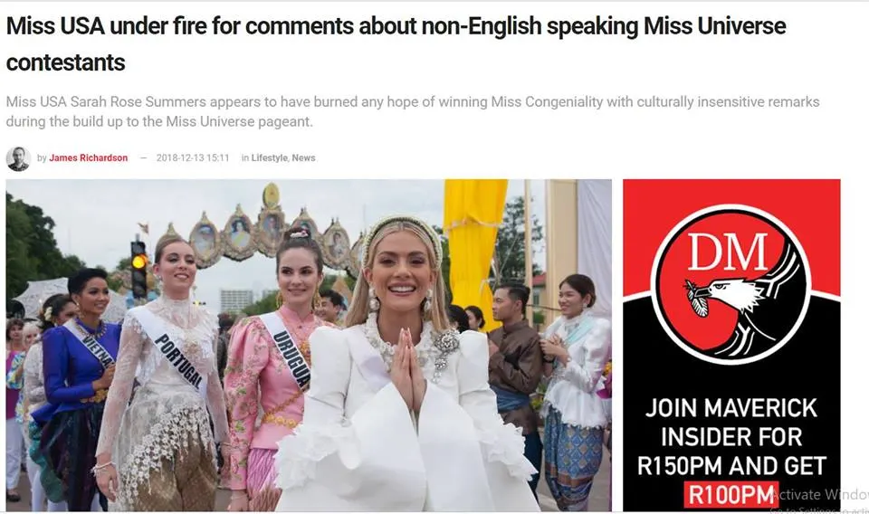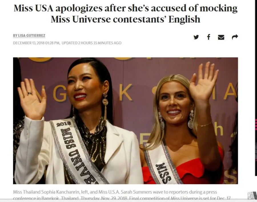 ในการประกวด MU 2018 ที่กำลังจะจัดขึ้นในบ้านเรานี้เอง มีคลิปเผยแพร่ทางโลกออนไลน์ เป็นคลิปของนางงามสหรัฐ ได้พูดคุยกับนางงาม ออสเตรเลียและโคลัมเบีย โดยเม้าท์มอยเรื่องที่ นางงามกัมพูชาและเวียดนามพูดภาษาอังกฤษไม่ได้ และนำมาซึ่งคลิปนางงามกัมพูชาร้องไห้ จนเกิดเสียงวิจารณ์อย่างหนักไปทั่วถึงพฤติกรรมของนางงามสหรัฐในสื่อออนไลน์และเว็บข่าวทั่วโลก