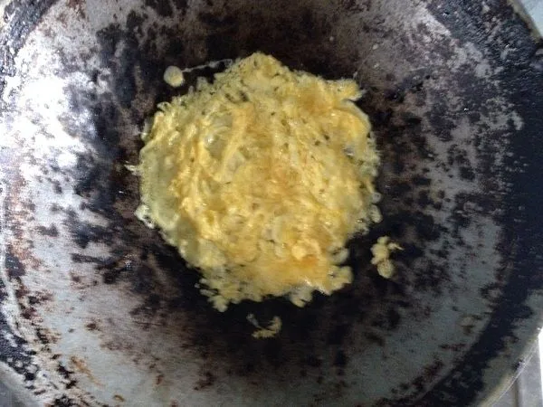 เคล็ดลับ : เมื่อนำไข่ลงในกระทะเเล้วต้องรีบใช้ส้อมตี ๆ หรือคน ๆ ทำอย่างไรก็ได้ให้ไข่กระจาย หรือถ้ากลัวน้ำมันกระเด็นให้นำตะเเกรงมาแล้วค่อย ๆ ใส่ไข่ลงไป จับตะเเกรงขึ้น ๆ ลง ๆ ก็จะทำให้ไข่กระจายค่ะ