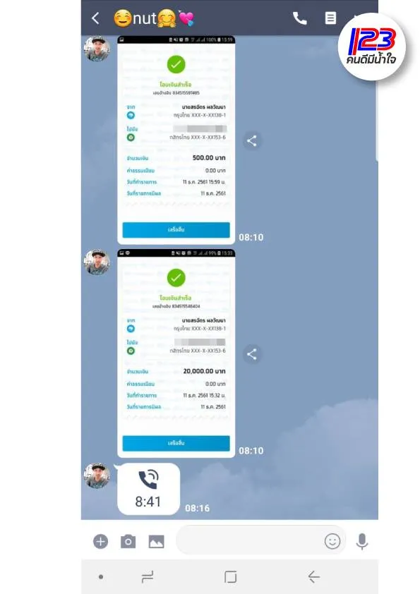 “นัท”ก็ใจดีเหลือเกิน ไว้ใจโอนเงินให้ไป 3 ครั้ง รวมเบ็ดเสร็จ 36,100 บาท เมื่อโอนเงินได้แล้ว ก็เริ่มติดต่อไม่ได้ แล้วหายไป ติดต่อไม่ได้เลย แต่เมื่อข่าวกระจายออกไป “นัท” ติดต่อกลับมาที่ “123 คนดีมีน้ำใจ”ว่า “เข้าใจผิด” เพราะนัท ติดต่อสาวเจ้าได้แล้ว สาวยืนยันว่าจะคืนเงินให้ ภายในสิ้นเดือนนี้ โธ่…นัท