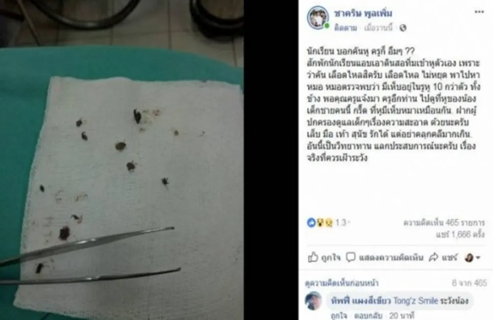 ขนลุกครูช็อกนักเรียนบ่นคันหู ใช้ปากกาแคะจนเลือดสาด ส่องดูถึงกับตกใจ เพราะเห็บหมาไต่ยั้วเยี้ยในหู จนต้องส่งโรงพยาบาลให้หมอช่วยเอาออก เตือนเป็นอุทาหรณ์หากรักสุนัขต้องดูแลเรื่องความสะอาดผู้ใช้เพจเฟซบุ๊ก "ชาคริษ พูลเพิ่ม"ได้โพสต์ข้อความระบุว่า นักเรียน บอกคันหู ครูก็ อืมๆ ?? สักพักนักเรียนแอบเอาดินสอทิ่มเข้าหูตัวเอง เพราะว่าคัน เลือดไหลสิครับ เลือดไหล ไม่หยุด พาไปหาหมอ หมอตรวจพบว่า มีเห็บอยู่ในรูหู 10 กว่าตัว ทั้งข้าง พอคุณครูแจ้งมา ครูอีกท่าน ไปดูที่หูของน้องเด็กชายคนนี้ กรี๊ด ที่หูมีเห็บหมาเหมือนกัน. ฝากผู้ปกครองดูแลเด็กๆเรื่องความสะอาด ด้วยนะครับ เล็บ มือ เท้า สุนัข รักได้ แต่อย่าคลุกคลีมากเกิน. อันนี้เป็นวิทยาทาน แลกประสบการณ์นะครับ เรื่องจริงที่ควรเฝ้าระวัง