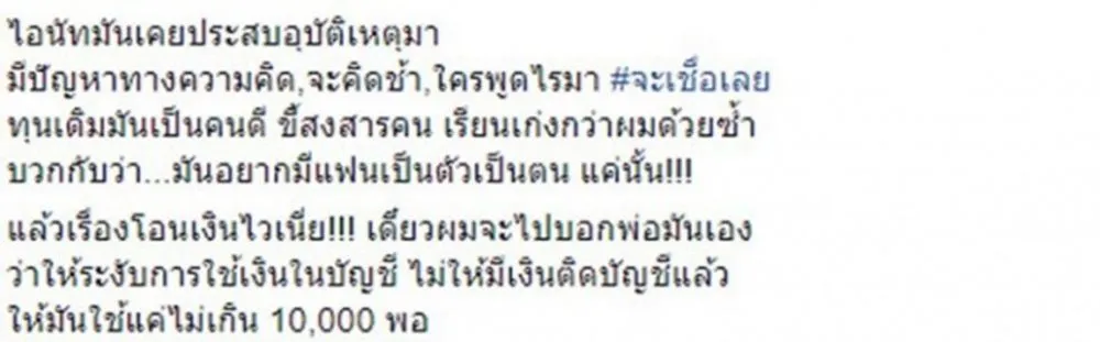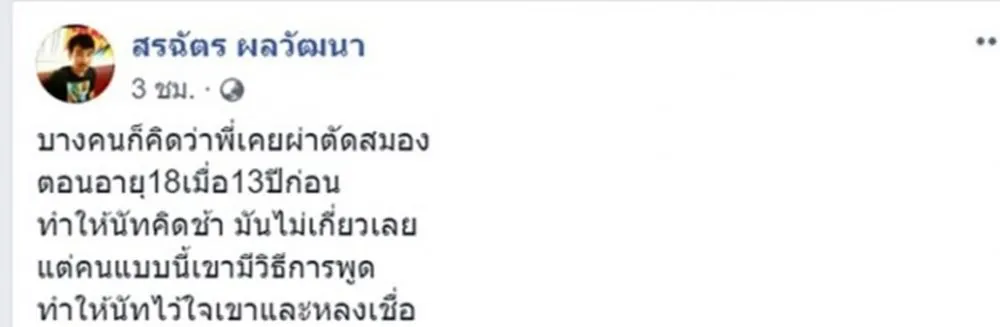ล่าสุดผู้ใช้เฟซบุ๊กชื่อ "ปาทิป ศรีประเสริฐ" ซึ่งเป็นเพื่อของหนุ่มนัทได้โพสต์ข้อความระบุว่า "ไอนัทมันเคยประสบอุบัติเหตุมา มีปัญหาทางความคิด, จะคิดช้า, ใครพูดไรมา #จะเชื่อเลย ทุนเดิมมันเป็นคนดี ขี้สงสารคน เรียนเก่งกว่าผมด้วยซ้ำ บวกกับว่า...มันอยากมีแฟนเป็นตัวเป็นตน แค่นั้น!!! แล้วเรื่องโอนเงินไวเนี่ย!!! เดี๋ยวผมจะไปบอกพ่อมันเอง ว่าให้ระงับการใช้เงินในบัญชี ไม่ให้มีเงินติดบัญชีแล้ว ให้มันใช้แค่ไม่เกิน 10,000 พอ และอีกข้อความว่า ไม่มีใครอยากโอนเงินให้ คนที่ไม่รู้จักหรอกครับ... แต่ไอนัทเป็นแบบนี้จริง ๆ คือใครพูดไรมา #จะเชื่อทันที ไอ้คนที่ปลอมเฟสมาหลอกนั่นแหละตัวดี รู้ว่าเพื่อนผมเป็นแบบนี้ #ก็ยังจะหลอกซ้ำอีก!!!! เกี่ยวกับเรื่องนี้ ล่าสุด นายสรฉัตร ได้โพสต์ข้อความผ่านเฟซบุ๊กชื่อ "สรฉัตร ผลวัฒนา" ว่า บางคนก็คิดว่าพี่เคยผ่าตัดสมอง ตอนอายุ 18 เมื่อ 13 ปีก่อน ทำให้นัทคิดช้า มันไม่เกี่ยวเลย แต่คนแบบนี้เขามีวิธีการพูด ทำให้นัทไว้ใจเขาและหลงเชื่อ