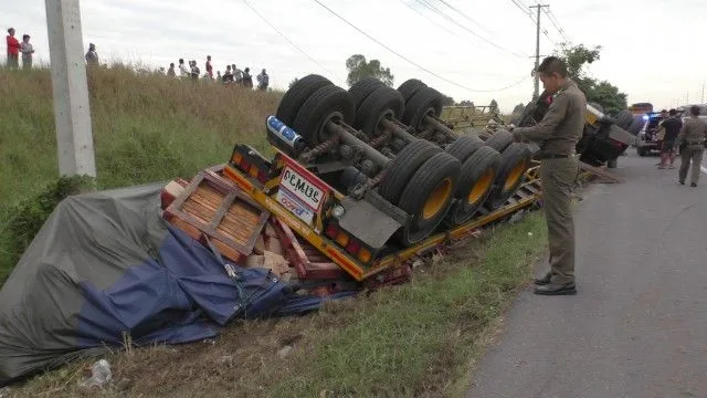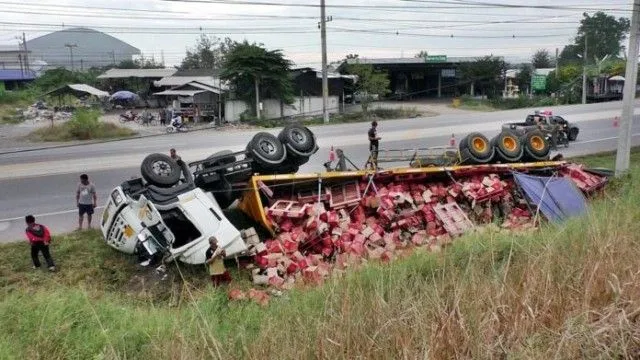 รถพ่วงขนเบียร์เทกระจาด เสียหลักตกข้างทาง เบียร์ 2,520 ลัง กระจายเกลื่อน