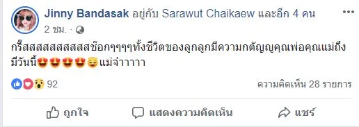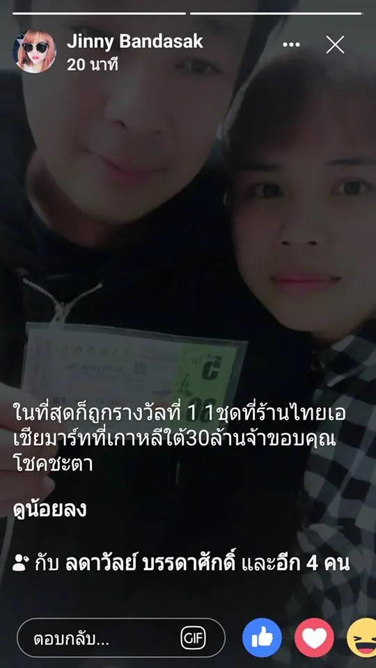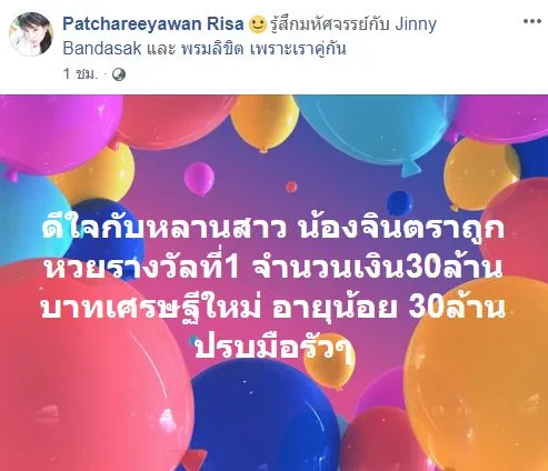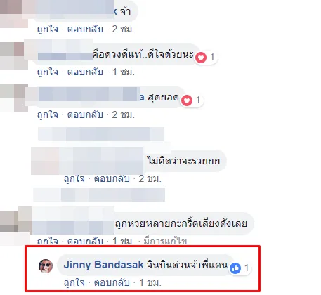 ทำให้มีเพื่อนพ้องในเฟซบุ๊กเข้ามาแสดงความคิดเห็น คอมเม้นต์แสดงความยินดีกันเป็นจำนวนมาก ว่าโชคดีที่ถูกรางวัลในงวดนี้ ส่งท้ายปี 2561
