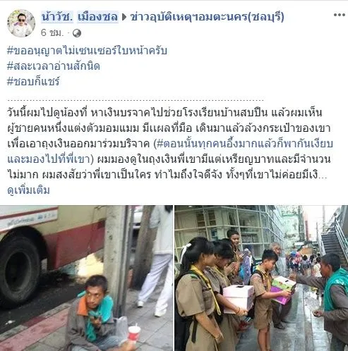 วันที่ 16 ธันวาคม 2561 เวลา 14.01 น. ที่ผ่านมา สมาชิกเฟสบุ๊คชื่อ “น้าวัช เมืองชน” ได้ออกมาเผยแพร่เรื่องราว ขออนุญาตสละเวลาอ่านสักนิด ผมและน้องๆไปรับบริจาคช่วยเหลือโรงเรียน ไม่น่าเชื่อ มีผู้ชายคนหนึ่งเนื้อตัวมอนแมม มาร่วมบริจาคเงิน พร้อมกับระบุข้อความว่า วันนี้ผมไปดูน้องที่ หาเงินบรจาคไปช่วยโรงเรียนบ้านสบปืน แล้วผมเห็นผู้ชายคนหนึ่งแต่งตัวมอมแมม มีเเผลที่มือ เดินมาแล้วล้วงกระเป๋าของเขาเพื่อเอาถุงเงินออกมาร่วมบริจาค (ตอนนั้นทุกคนอึ้งมากแล้วก็พากันเงียบและมองไปที่พี่เขา) ผมมองดูในถุงเงินพี่เขามีแต่เหรียญบาทและมีจำนวนไม่มาก ผมสงสัยว่าพี่เขาเป็นใคร ทำไมถึงใจดีจัง ทั้งๆที่เขาไม่ค่อยมีเงินแต่เขายังรู้จักช่วยเหลือสังคม (ซึ่งดีกว่าคนที่รวยและมีอำนาจล้นฟ้า แต่ไม่เคยทำอะไรเพื่อสังคม) ต่อ.หลังจากพี่เขาบริจาค น้องผู้ชายเป็นตุ๊ด ที่ถือกล่องเลยบอกว่าขอบคุณค่ะ พี่เขาเลยพูดขึ้นว่า ต้องครับสิ (ทุกคนหัวเราะ) แล้วพี่เขาก็เดินจากไปสักพักผมก็เลยบอกน้องว่าจะกลับบ้าน ผมเลยเดินมาที่ป้ายรถเมล์ที่ Big C ราม แล้วก็ได้เจอพี่เขาอีกครั้ง ผมจึงรู้ว่าจริงๆแล้วพี่เขาคือใคร เขาคือคนดีไง ถ้าเจอพี่เขาก็ช่วยเหลือกันนะครับ