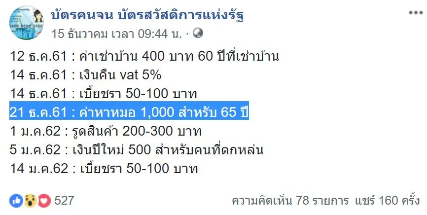 หลังจากที่มีการโอนเงินเข้าบัตรสวัสดิการแห่งรัฐไปแล้ว สำหรับของขวัญปีใหม่ กับผู้มีรายได้น้อย ภายในวันที่ 8-10 ธ.ค. ที่ทำให้บรรยากาศบริเวณตู้เอทีเอ็มธนาคารกรุงไทย ทุกที่ทั่วทั้งประเทศนั้นเต็มไปด้วยประชาชน ที่มาต่อคิวเพื่อกดเงินกันเป็นจำนวนมาก โดยล่าสุดเมื่อวันที่ 15 ธันวาคม 61 ที่ผ่านมา ทางเพจ”บัตรคนจน บัตรสวัสดิการแห่งรัฐ” ได้โพสต์ประชาสัมพันธ์เกี่ยวกับวันที่ของการโอนเงินเข้าบัตรสวัสดิการแห่งรัฐให้กับประชาชนได้รู้ และเตรียมพร้อมสำหรับผู้ที่ยังไม่ได้รับหรือผู้ที่มีสิทธิ์รับ โดยมีรายละเอียดในการรับเงินไม่เหมือนกัน