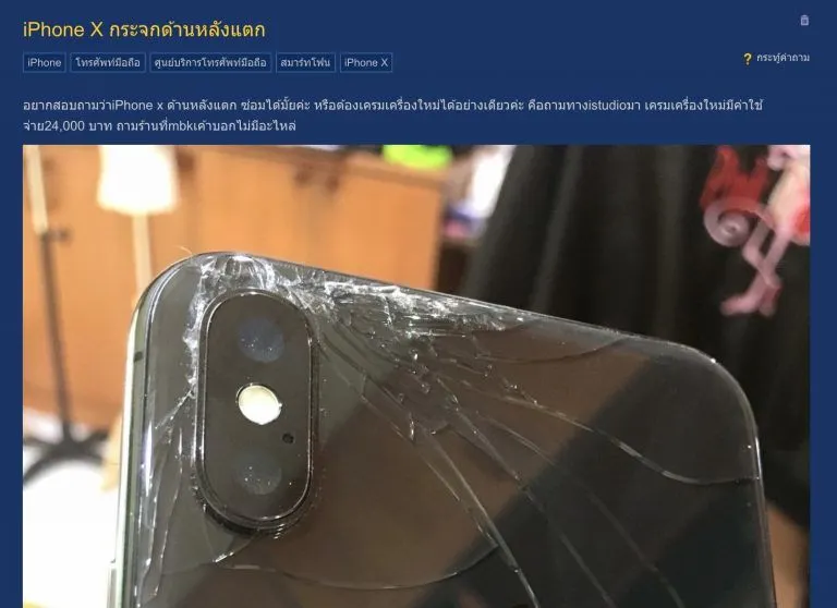 เป็นอุทาหรณ์ของคนเลี้ยงสุนัขที่ต้องอ่านเลยทีเดียว เมื่อ สมาชิกพันทิปรายหนึ่ง โพสต์กระทู้ พร้อมภาพเล่าเรื่องราวเกี่ยวกับโทรศัพท์มือถือ ไอโฟน เอ็กซ์ ที่กระจกด้านหลังแตก เนื่องจากถูกหมากัด โดยไม่สามารถซ่อมได้ เนื่องจากไม่มีอะไหล่ และหากไปเปลี่ยนเครื่องใหม่ต้องใช้เงินถึง 24,000 บาท