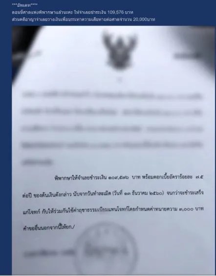 ตนจึงนำเรื่องไปฟ้องศาลแพ่ง โดยทนายให้เอาโทรศัพท์ไปเคลม จะได้เอาหลักฐานการเคลมไปฟ้อง ต่อมาศาลแพ่งพิพากษาแล้วนะคะ ให้จำเลยชำระเงิน 109,576 บาท ส่วนคดีอาญาจำเลยวางเงินเพื่อบรรเทาความเสียหายต่อศาลจำนวน 20,000 บาท โดยมีชาวเน็ตจำนวนมากที่เข้ามาแสดงความชื่นชมเจ้าของกระทู้นี้เป็นจำนวนมาก พร้อมตำหนิเจ้าของหมาที่ไม่มีความรับผิดชอบ