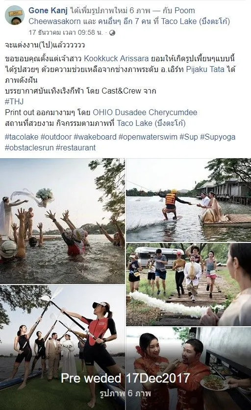 ขอขอบคุณตั้งแต่เจ้าสาว Kookkuck Arissara ยอมให้เกิดรูปเพี้ยนๆแบบนี้ ได้รูปสวยๆ ด้วยความช่วยเหลือจากช่างภาพระดับ อ.เอิร์ท Pijaku Tata ได้ภาพดังฝัน บรรยากาศบันเทิงเริงกีฬา โดย Cast&Crew จาก #THJ Print out ออกมางามๆ โดย OHIO Dusadee Cherycumdee สถานที่สวยงาม กิจกรรมตามภาพที่ Taco Lake (บึงตะโก้)#tacolake #outdoor #wakeboard #openwaterswim #Sup #Supyoga #obstaclesrun #restaurant