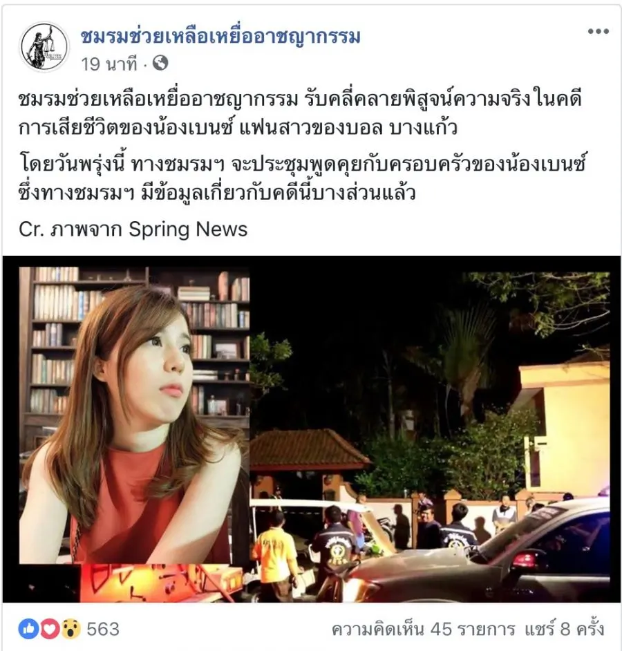 จากกรณีไฟไหม้บ้านของนายพงษ์เพชร สินสุวรรณ หรือบอล อดีตนักร้องวงบางแก้ว ภายในหมู่บ้านธัญธานี ต.ลาดสวาย อ.ลำลูกกา จ.ปทุมธานี เป็นคฤหาสน์หรู 2 ชั้น ไฟลุกไหม้บริเวณห้องพระชั้น 2 ภายในห้องน้ำพบผู้เสียชีวิต 1 รายทราบชื่อคือ น.ส.สุภาณี หรือเบนซ์ สินอนันต์ตระกูล อายุ 27 ปี เป็นภรรยาของนายพงษ์เพชร ขณะที่ นายบัญญัติ สินอนันต์ตระกูล อายุ 61 ปี พ่อของ น.ส.สุภาณี ไม่เชื่อลูกสาวสำลักควันดับและสุดทางเพจ “ชมรมช่วยเหลือเหยื่ออาชญากรรม” โดยมี “อัจฉริยะ เรืองรัตนพงศ์” เป็นประธานชมรม ได้ออกมาโพสต์ระบุข้อความว่า “ชมรมช่วยเหลือเหยื่ออาชญากรรม รับคลี่คลายพิสูจน์ความจริงในคดีการเสียชีวิตของน้องเบนซ์ แฟนสาวของบอล บางแก้ว โดยวันพรุ่งนี้ ทางชมรมฯ จะประชุมพูดคุยกับครอบครัวของน้องเบนซ์ ซึ่งทางชมรมฯ มีข้อมูลเกี่ยวกับคดีนี้บางส่วนแล้ว”