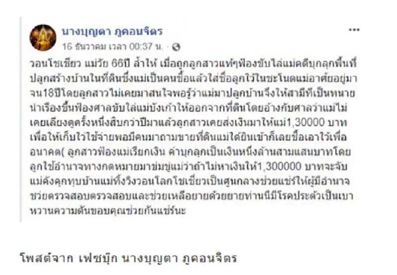 กลายเป็นเรื่องราวชวนสะเทือนใจไม่น้อย กรณีผู้ใช้เฟซบุ๊ก นางบุญตา ภูคอนจิตร ตีแผ่เหตุการณ์ที่ยายวัย 66 ปี ซึ่งปลูกบ้านอาศัยในที่ดินของลูกสาว แต่ต่อมากลับถูกลูกแท้ ๆ ฟ้องร้องข้อหาบุกรุก และให้จ่ายเงิน 1.3 ล้านบาท ไม่เช่นนั้นจะต้องติดคุก