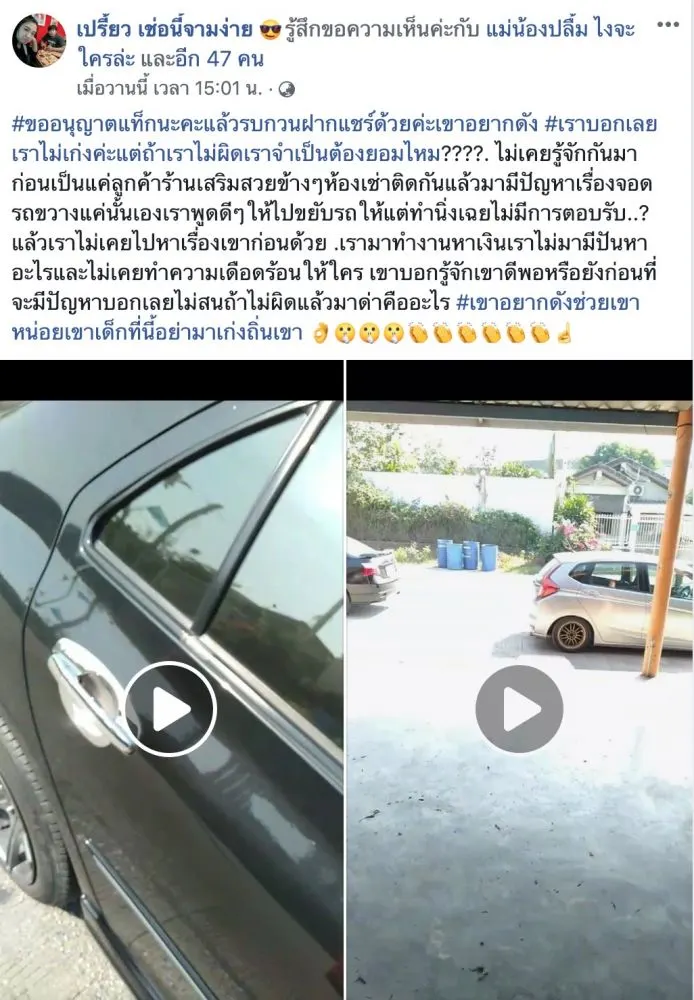 “ขออนุญาตแท็กนะคะแล้วรบกวนฝากแชร์ด้วยค่ะเขาอยากดัง #เราบอกเลยเราไม่เก่งค่ะแต่ถ้าเราไม่ผิดเราจำเป็นต้องยอมไหม????. ไม่เคยรู้จักกันมาก่อนเป็นแค่ลูกค้าร้านเสริมสวยข้างๆห้องเช่าติดกันแล้วมามีปัญหาเรื่องจอดรถขวางแค่นั้นเองแล้วเราไม่เคยไปหาเรื่องเขาก่อนด้วยเรามาทำงานหาเงินเราไม่มามีปันหาอะไรและไม่เคยทำความเดือดร้อนให้ใคร เขาบอกรู้จักเขาดีพอหรือยังก่อนที่จะมีปัญหาบอกเลยไม่สนถ้าไม่ผิดแล้วมาด่าคืออะไร #เขาอยากดังช่วยเขาหน่อยเขาเด็กที่นี้อย่ามาเก่งถิ่นเขา”
