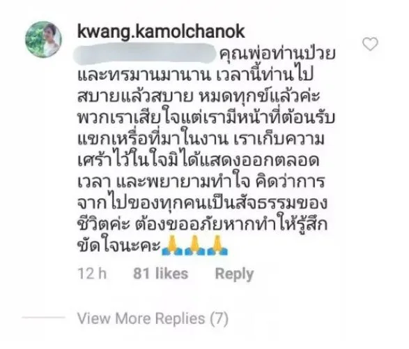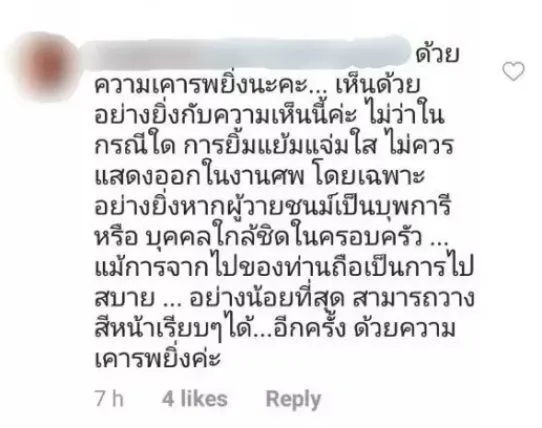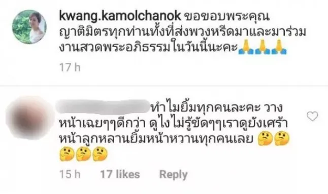 กลายเป็นประเด็นดราม่าจนได้ เมื่อนักแสดงสาวมากฝีมือ กวาง กมลชนก เขมะโยธิน โพสต์ภาพบรรยากาศงานศพคุณพ่อของสามีหนุ่ม น็อต นุติ เขมะโยธิน โดยในภาพดังกล่าวกวางและครอบครัวมีสีหน้ายิ้ม จนทำให้บางคนเข้ามาวิพากษ์วิจารณ์ถึงรูปดังกล่าว