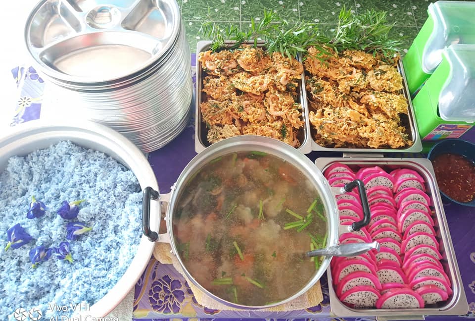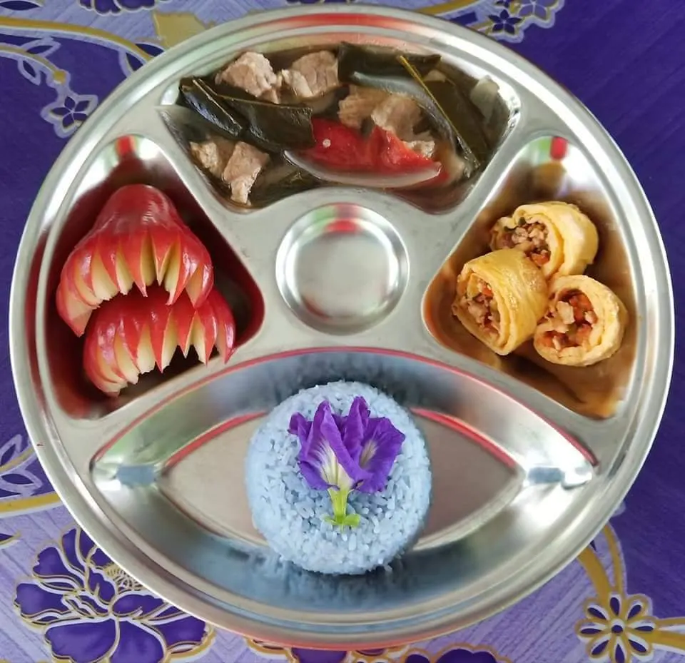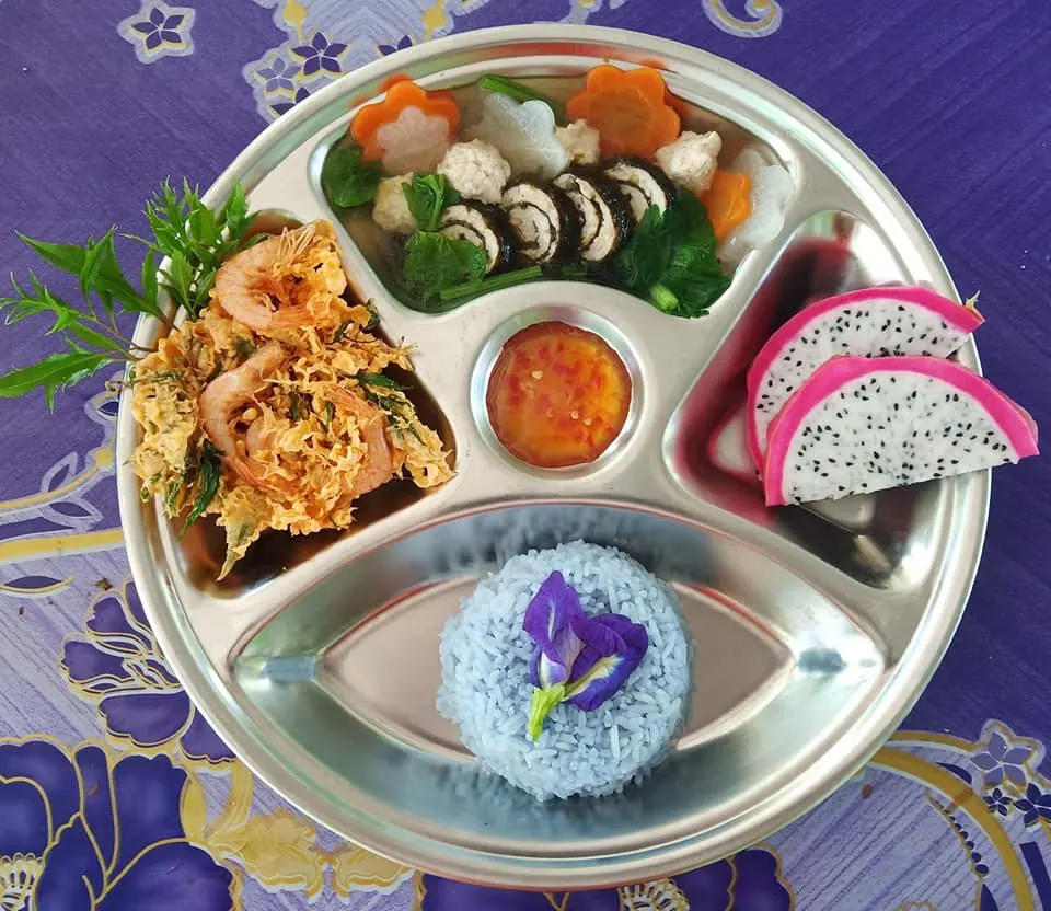 ข้าวสวยอัญชัน แกงจืดไก่ห่อสาหร่าย กุ้งชุปแป้งทอด ผลไม้แก้วมังกรค่ะ