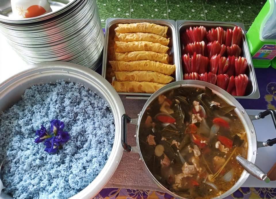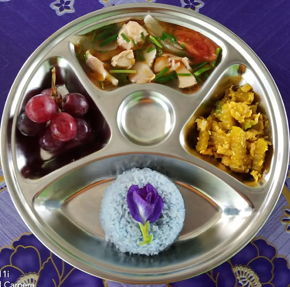 ต้มยำไก่เห็ดนางฟ้า ข้าวสวยดอกอัญชัน ฟักทองผัดไข่ ผลไม้องุ่น