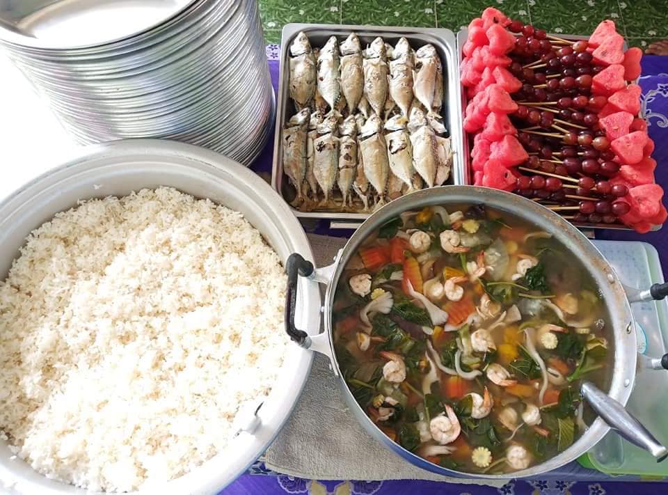 ข้าวสวย แกงเลียงกุ้งสด ปลาทูนึ่ง ผลไม้องุ่น,แตงโม