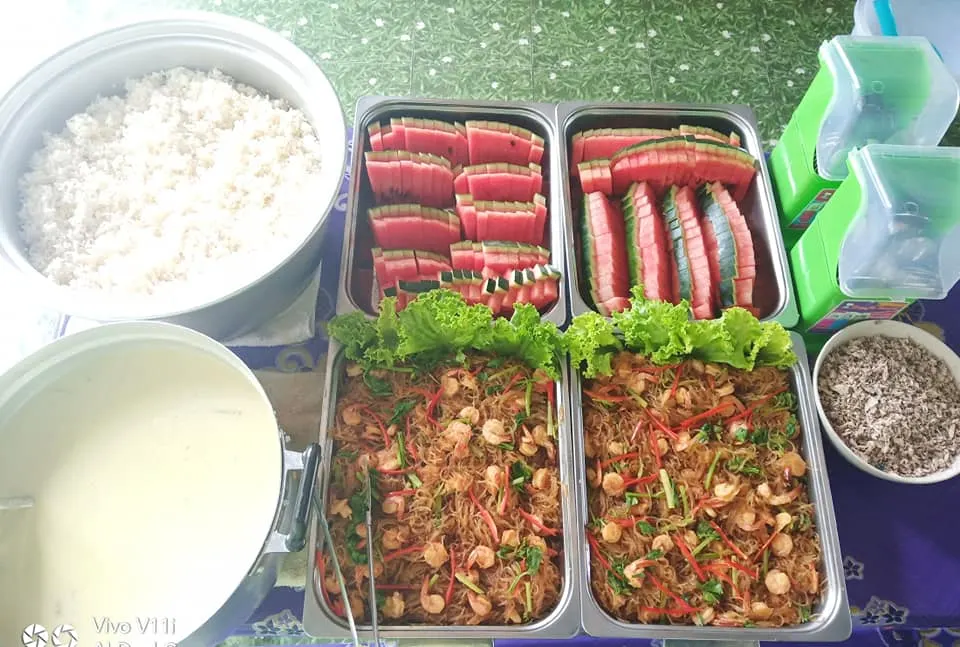ข้าวสวย ต้มกะทิปลาโอ กุ้งอบวุ้นเส้น ผลไม้แตงโมค่ะ